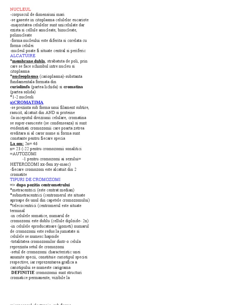 si cellule anucleate, binucleate, polinucleate -forma nucleului este diferita si corelata cu forma celulei -nucleul poate fi situate central si periferic ALCATUIRE *membrane dubla, strabatuta de poli, prin care se face schimbul intre nucleu si citoplasma *nucleoplasma (carioplasma)-substanta fundamentala formata din curiolimfa (partea lichida) si cromatina (partea solida) *1-2 nucleoli a)CROMATIMA -se prezinta sub forma unui filament subtire, rasucit, alcatuit din AND si proteine -la inceputul diviziunii celulare, cromatina se super-rasuceste (se condenseaza) si sunt evidentiati cromozomii care poarta zetrea ereditara si al caror nume si forma sunt constante pentru fiecare specia La om: 2n= 46 n= 23 (-22 pentru cromozomii sonalitici =AUTOZOMI -1 pentru cromozomi ai sexului= HETEROZOMI xx-fem xy-masc) -fiecare cromozom este alcatuit din 2 cromatite TIPURI DE CROMOZOMI => dupa pozitia centrometrului *metracentrici (este centrat median) *submetracentrici (centromerul ste situate aproape de unul din capetele cromozomului) *telecocentrici (centromerul este situate terminal -in celulele somatice, numarul de cromozomi este dublu (cellule diploide- 2n) -in celulele eproducatoare (gometi) numarul de cromozomi este redus la jumatate si celulele se numesc hapoide -totalitatea cromozomilor dintr-o celula reprezinta setul de cromozomi -setul de cromozomi characteristic unei anumite specii, constituie curiotipul speciei respective, iar reprezentarea grafica a cariotipului se numeste carigrama DEFINITIE cromozomii sunt structuri cromatice permanente, vizibile la