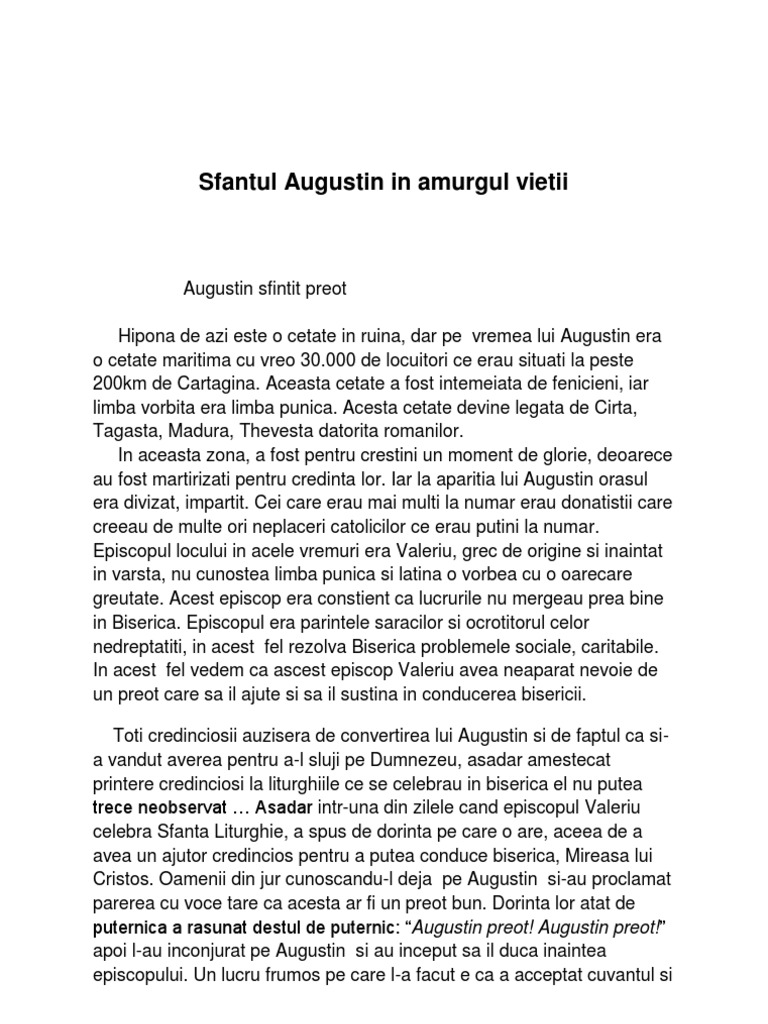 Vointa Divina ce s-a aratat atat de clar. Emotiile ce l-au cuprins erau atat de mari incat a varsat siroaie de lacrimi pe obraji, stiind ce il asteapta insa oamenii il incurajau zicand: Desigur ai fi meritat ceva mai bun, dar fi cu rabdare, preotia nu e atat de departe de episcopat!1 . Apoi este sfintit preot dupa cateva zile de pregatire. Am vrut sa va povestesc putin despre Augustin cum a devenit el preot si cum Dumnezeu stie ca o anumita cale sau alta duce la fericirea si indeplinirea sufletului nostru atunci isi face auzit glasul, atunci si cel chemat recunoaste glasul pastorului care il cheama pe nume. Asa si Augustin al nostru in acel moment a auzit glasul Blandului Pastor si stiind si mereu considerandu-se nevrednic, si-a dat seama ca aceasta e vointa Domnului, o vointa ce il va purta pe nici nu stiu unde. El se intreaba: De ce oare a permis Dumnezeu sa ii se intample oare asa ceva? Desigur e din cauza pacatelor e ca o pedeapsa. Intr-adevar, marturiseste el cu umilinta, ca nou botezat, plin de ravna, mi-am permis sa judec fratii mei, sa critic pe carmacii barcii lui Cristos, socotind ca ei ar putea lucrea mai bine. Insa Dumnezeu mi-a aratat nevrednicia mea!2, aici ar trebui sa apreciem aceasta fapt de umilinta si sinceritate pe care a avut-o Augustin .