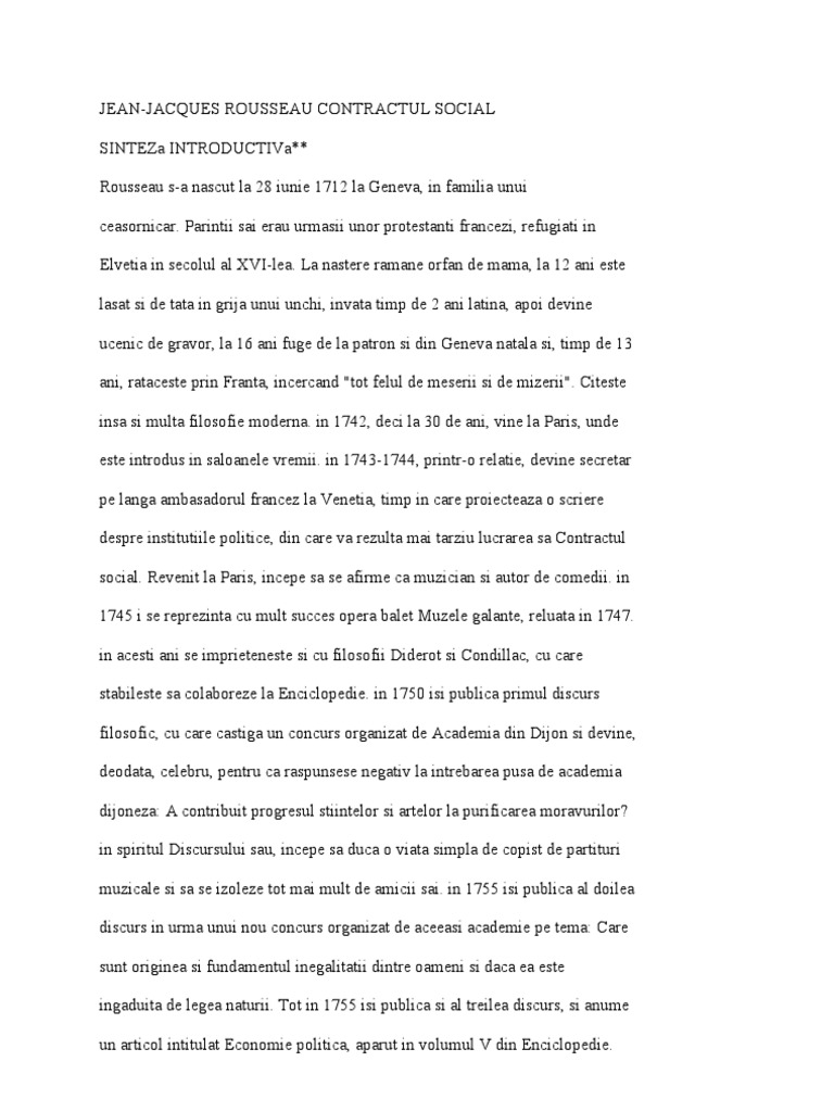 intre 1755-1760 se retrage la tara, se rupe de enciclopedisti, polemizeaza cu * Jean-Jacques Rousseau, Contractul social, Editura Stiintifica, 1957. Traducere de H.H. Stahl. ** Sinteza introductiva de Ioan N. Rosca. Universitatea Spiru Haret 194 Voltaire, se cearta cu Diderot, dar lucreaza intens. Principalele rezultate ale acestei activitati vor fi romanul epistolar Noua Eloiza, 1761, prin care este unul din pionierii romantismului literar, romanul pedagogic si filosofic Emil sau Despre educatie, 1762, si faimoasa opera de filosofie sociala Contractul social. Autoritatile pariziene interzic lucrarea Emil pentru profesarea religiei naturale si decid sa-l aresteze pe autor. in consecinta, intre 1762-1765 Rousseau se exileaza in principatul Neuchatel, in 1766-1767 se afla in Anglia la invitatia lui David Hume, apoi peregrineaza in Franta si, in 1770, revine la Paris, ducand o viata retrasa si fiind tolerat de autoritati. S-a stins din viata la 2 iulie 1778 la Ermenonville, langa Chantilly. in 1794, printr-o hotarare a Conventiei Nationale, osemintele sale sunt mutate in Panteon, intr-un sarcofag invecinat cu acela al lui Voltaire. in perioada exilului si a revenirii pariziene, pe langa doua scrieri politice, despre legislatia Corsicii si despre guvernamantul Poloniei, si o lucrare de botanica, Rousseau a realizat mai multe lucrari literare, intre care, in ordine cronologica, trilogia Confesiuni, trei Dialoguri intitulate Rousseau judecator al lui Jean-Jacques si, in ultimii ani, Visarile unui hoinar singuratic, de o seninatate desavarsita. Tematic, in ordinea aparitiei lor, lucrarile teoretice ale lui Rousseau s-au preocupat de om si cultura (primul Discurs), de societatea ideala