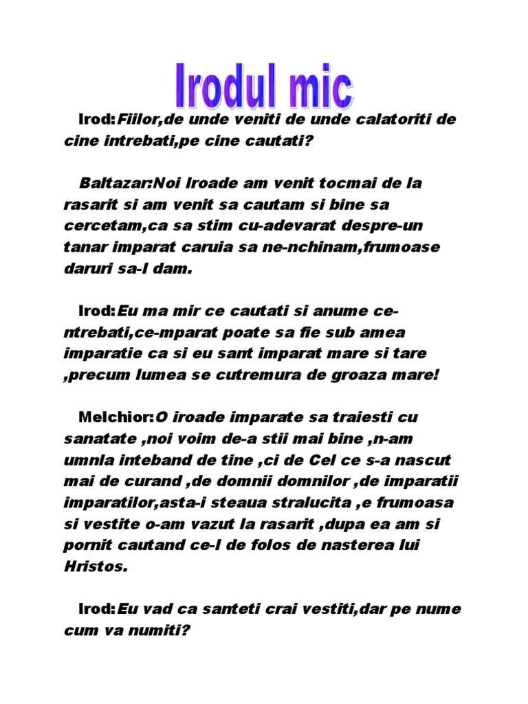 Irod:Eu ma mir ce cautati si anume centrebati,ce-mparat poate sa fie sub amea imparatie ca si eu sant imparat mare si tare ,precum lumea se cutremura de groaza mare! Melchior:O iroade imparate sa traiesti cu sanatate ,noi voim de-a stii mai bine ,n-am umnla inteband de tine ,ci de Cel ce s-a nascut mai de curand ,de domnii domnilor ,de imparatii imparatilor,asta-i steaua stralucita ,e frumoasa si vestite o-am vazut la rasarit ,dupa ea am si pornit cautand ce-I de folos de nasterea lui Hristos. Irod:Eu vad ca santeti crai vestiti,dar pe nume cum va numiti?