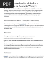 Acarioza Este o boal grav a albinelor cauzat de parazii din familia acarienilor Acarapis Woodi, care ajung n traheea albinelor tinere unde depun 20-30 ou. Att parazitul adult ct i descendena, se hrnesc cu hemolimfa gazdei i secret toxine care afecteaz nervii motorii ai aripilor, numrul din ce n ce mai mare ai paraziilor mpiedicnd normala funcionare a cilor respiratorii. Albinele mature de 12-15 zile nu mai pot fi atacate, datorit periorilor stigmatelor care la acestea devin epoi, barnd astfel intrarea. Acarienii se nmulesc mai ales atunci cnd albina se afl n ghem (iarna i vara pe timp ploios). Tratamentul clasic se face prin fumigaii cu Folbex (de 8 ori din 7 n 7 zile) sau cu Varachet. Stupina infectat trebuie s rmn pe loc pn la terminarea tratamentului, dup care va fi dus la un cules bun, la cel puin 3-5 km distan de alte stupine. Exist supoziii n legtur cu prezena bolii atunci cnd exist depopulri n mas primvara, cnd albinele nainteaz n salturi, prezint tremurturi ale corpului, in aripile deprtate i se adun n grupe mici nainte de a muri. Un diagnostic precis nu poate fi pus dect prin examen de laborator.