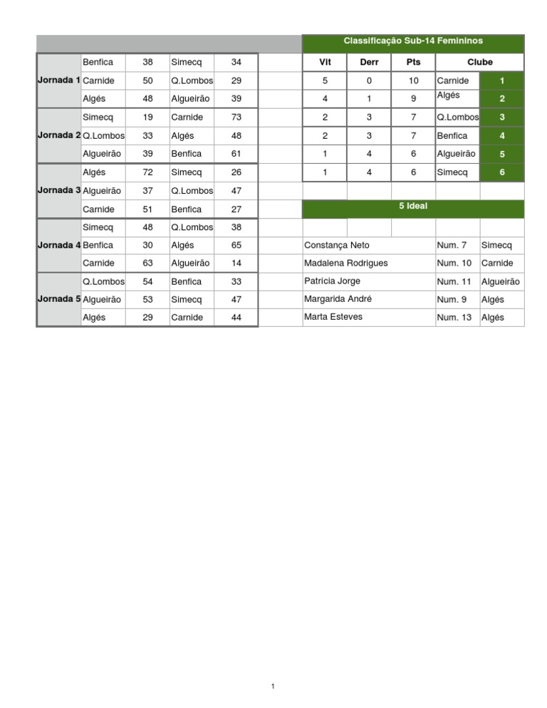 Lombos Algueiro Algs Jornada 3 Algueiro Carnide Simecq Jornada 4 Benfica Carnide Q.Lombos Jornada 5 Algueiro Algs 38 50 48 19 33 39 72 37 51 48 30 63 54 53 29 Simecq Q.Lombos Algueiro Carnide Algs Benfica Simecq Q.Lombos Benfica Q.Lombos Algs Algueiro Benfica Simecq Carnide 34 29 39 73 48 61 26 47 27 38 65 14 33 47 44 Constana Neto Madalena Rodrigues Patrcia Jorge Margarida Andr Marta Esteves Num. 7 Num. 10 Num. 11 Num. 9 Num. 13 Simecq Carnide Algueiro Algs Algs 5 Ideal Vit 5 4 2 2 1 1 Derr 0 1 3 3 4 4 Pts 10 9 7 7 6 6 Clube Carnide Algs Q.Lombos Benfica Algueiro Simecq 1 2 3 4 5 6