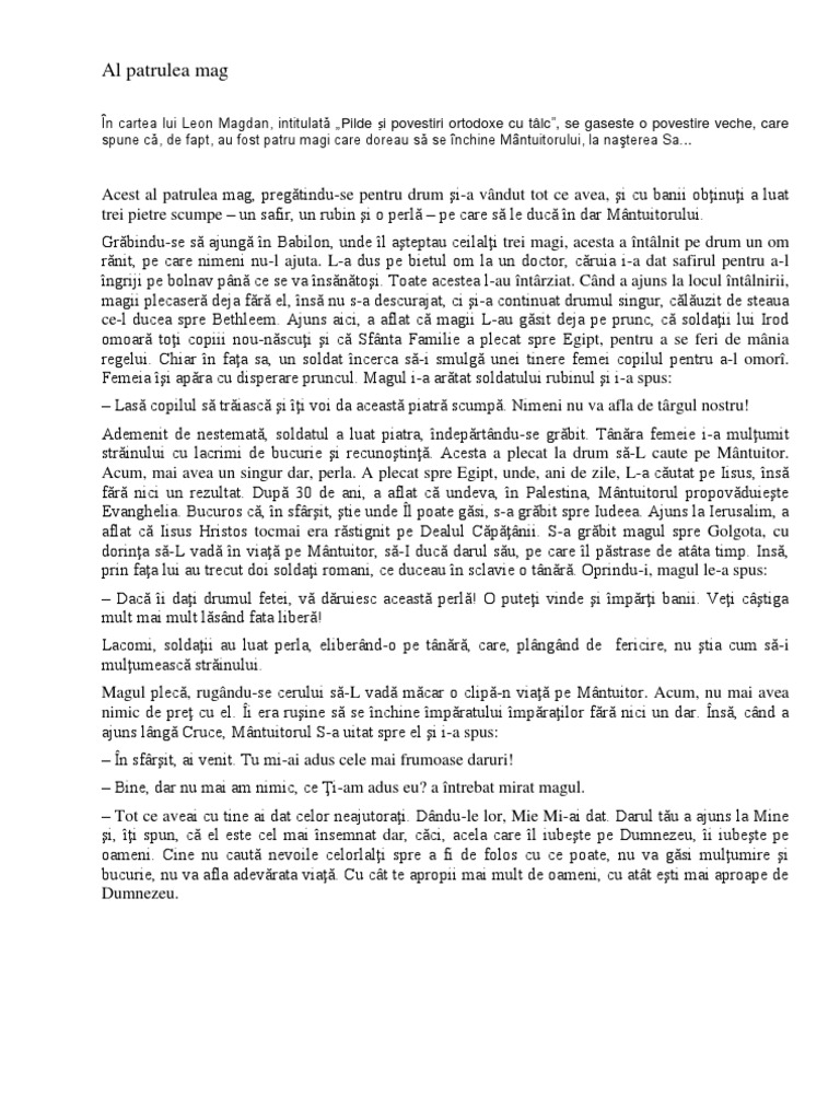 Acest al patrulea mag, pregtindu-se pentru drum i-a vndut tot ce avea, i cu banii obinui a luat trei pietre scumpe un safir, un rubin i o perl pe care s le duc n dar Mntuitorului. Grbindu-se s ajung n Babilon, unde l ateptau ceilali trei magi, acesta a ntlnit pe drum un om rnit, pe care nimeni nu-l ajuta. L-a dus pe bietul om la un doctor, cruia i-a dat safirul pentru a-l ngriji pe bolnav pn ce se va nsntoi. Toate acestea l-au ntrziat. Cnd a ajuns la locul ntlnirii, magii plecaser deja fr el, ns nu s-a descurajat, ci i-a continuat drumul singur, cluzit de steaua ce-l ducea spre Bethleem. Ajuns aici, a aflat c magii L-au gsit deja pe prunc, c soldaii lui Irod omoar toi copiii nou-nscui i c Sfnta Familie a plecat spre Egipt, pentru a se feri de mnia regelui. Chiar n faa sa, un soldat ncerca s-i smulg unei tinere femei copilul pentru a-l omor. Femeia i apra cu disperare pruncul. Magul i-a artat soldatului rubinul i i-a spus: Las copilul s triasc i i voi da aceast piatr scump. Nimeni nu va afla de trgul nostru! Ademenit de nestemat, soldatul a luat piatra, ndeprtndu-se grbit. Tnra femeie i-a mulumit strinului cu lacrimi de bucurie i recunotin. Acesta a plecat la drum s-L caute pe Mntuitor. Acum, mai avea un singur dar, perla. A plecat spre Egipt, unde, ani de zile, L-a cutat pe Iisus, ns fr nici un rezultat. Dup 30 de ani, a aflat c undeva, n Palestina, Mntuitorul propovduiete Evanghelia. Bucuros c, n sfrit, tie unde l poate gsi, s-a grbit spre Iudeea. Ajuns la Ierusalim, a aflat c Iisus Hristos tocmai era rstignit pe Dealul Cpnii. S-a grbit magul spre Golgota, cu dorina s-L vad n via pe Mntuitor, s-I duc darul su, pe care l pstrase de atta timp. Ins, prin faa lui au trecut doi soldai romani, ce duceau n sclavie o tnr. Oprindu-i, magul le-a spus: Dac i dai drumul fetei, v druiesc aceast perl! O putei vinde i mpri banii. Vei ctiga mult mai mult lsnd fata liber! Lacomi, soldaii au luat perla, elibernd-o pe tnr, care, plngnd de fericire, nu tia cum s-i mulumeasc strinului. Magul plec, rugndu-se cerului s-L vad mcar o clip-n via pe Mntuitor. Acum, nu mai avea nimic de pre cu el. i era ruine s se nchine mpratului mprailor fr nici un dar. ns, cnd a ajuns lng Cruce, Mntuitorul S-a uitat spre el i i-a spus: n sfrit, ai venit. Tu mi-ai adus cele mai frumoase daruri! Bine, dar nu mai am nimic, ce i-am adus eu? a ntrebat mirat magul. Tot ce aveai cu tine ai dat celor neajutorai. Dndu-le lor, Mie Mi-ai dat. Darul tu a ajuns la Mine i, i spun, c el este cel mai nsemnat dar, cci, acela care l iubete pe Dumnezeu, i iubete pe oameni. Cine nu caut nevoile celorlali spre a fi de folos cu ce poate, nu va gsi mulumire i bucurie, nu va afla adevrata via. Cu ct te apropii mai mult de oameni, cu att eti mai aproape de Dumnezeu.