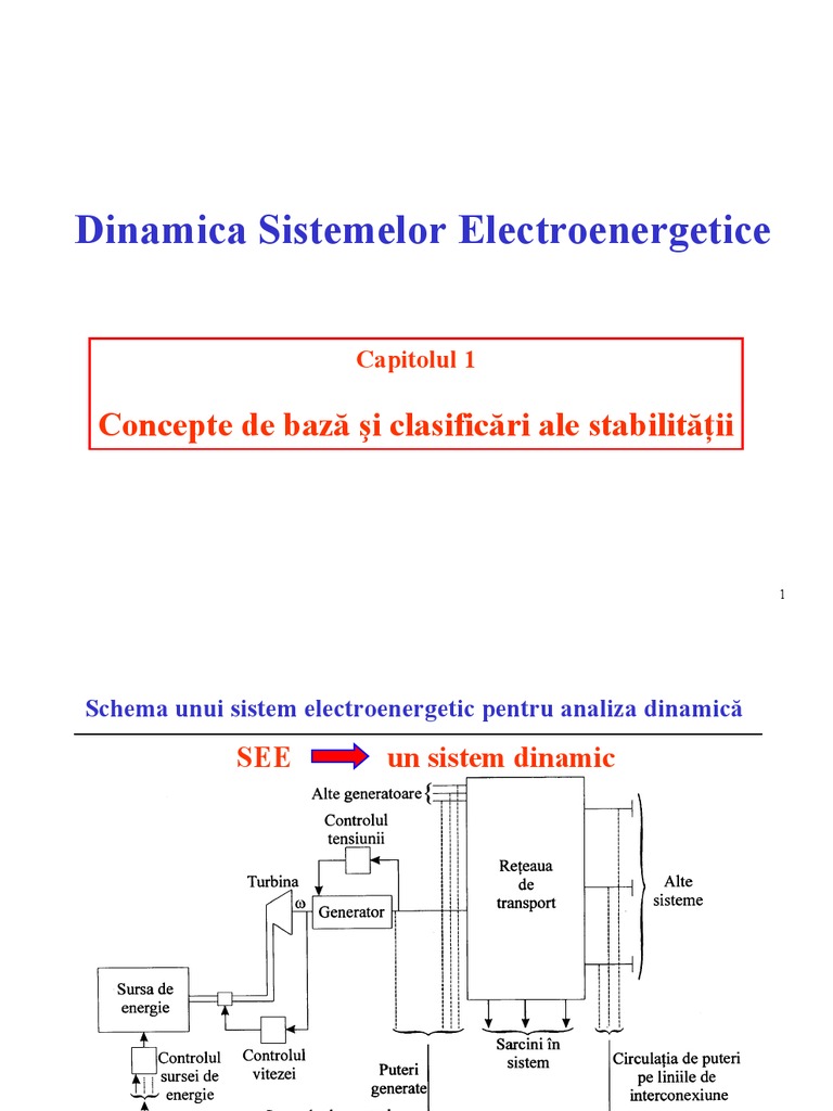 Concepte de baz i clasificri ale stabilitii Clasificarea proceselor dinamice din SEE Dinamici ultrarapide Timp de desfurare: micro- sau milisecunde Cauze: procesele din reelele electrice de transport, din statorul generatorului, etc. Dinamici pe termen scurt Timp de desfurare: secunde Cauze: procesele tranzitorii electromecanice i electromagnetice din rotorul generatoarelor, motoarelor sincrone i asincrone etc. Dinamici lente (dinamici pe termen mediu i lung) Timp de desfurare: minute, respectiv zeci de minute Cauze: procesele de restabilire a sarcinii datorate aciunii trafo. cu reglaj sub sarcin, limitrii curenilor din statorul i rotorul generatoarelor sincrone, proceselor din turbin i cazan etc.
