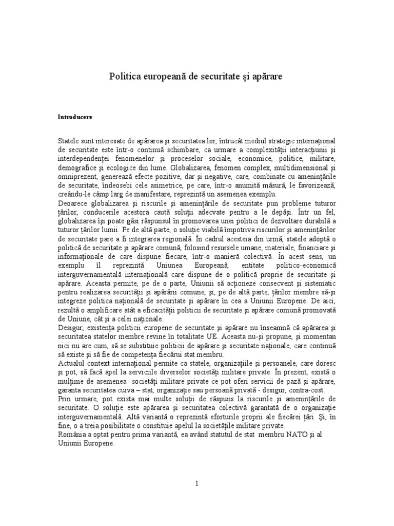 1. Ce reprezint PESA? Politica European de Securitate i Aprare (PESA) are drept obiectiv s permit Uniunii dezvoltarea capacitilor sale civile i militare de gestionare a crizelor i prevenire a conflictelor la nivel binternaional. Astfel, contribuia sa la meninerea pcii i a securitii internaionale, potrivit Cartei ONU, ar spori considerabil, adic pe msura forei sale economice i demografice. De la nceput trebuie menionat c PESA nu implic crearea unei armate europene, ci ea evolueaz de o manier compatibil i coordonat cu Organizaia Atlanticului de Nord. Ideea unei aprri europene autonome a suscitat, n cadrul UE, discuii controversate, legate, n principal, de slbiciunea structurilor existente i a complexitii rolului lor, dar i de angajamentul american pe solul Vechiului Continent. Consensul aprut n jurul voinei de a europeniza aprarea a disimulat n realitate numeroase contradicii i discordii, cu privire la aspectele strategice, militare i instituionale ale unei astfel de securiti. De asemenea, o absen a armonizrii concepiei statelor membre asupra finalitilor i modalitilor unei aprri europene a fcut mult vreme ca instituiile create n acest scop s se dovedeasc puin eficace. Aprarea Europei se sprijin astzi, nc, n mare parte pe prezena, din anii 50, pe continent, a trupelor americane i a armelor nucleare cu efect descurajator. Dar aceast situaie, n care 230 milioane de americani sunt nsrcinai s apere 500 milioane de europeni, pare anacronic i nu se poate pereniza, din motive politice, strategice i economice. Disensiunile n snul statelor membre ale UE favorabile unei aprri pur europene sau chiar unui pilon european al Alianei Nord-Atlantice i celelalte dornice s rmn sub protecia ntreag a NATO, au aprut n plin lumin, dup schimbrile intervenite n Est, dup Rzboiul din Golf i din Bosnia i Kosovo. Oricare ar condiiile dificile de natere a PESA, aceasta din urm se caracterizeaz prin faptul c ea rmne cu o anume fragilitate, cci este colectiv i constituie un proces, nainte de a fi un fapt mplinit. Ea este colectiv, n sensul c s-a decis n comun ce coninut concret va avea PESA. Practic, PESA este rezultatul acordurilor semnate de ctre statele membre de-a lungul timpului. n fine, este vorba de un proces, n sensul c, de acum nainte, capacitile europene, prin adoptarea unui obiectiv int headline goal -, sunt n centrul proiectului de aprare european. Pentru a depi aceste provocri i a asigura buna tranziie a structurilor militare tradiionale ctre noi structuri de aprare i securitate europene, precum i pentru a duce la bun sfrit noua etap a ridicrii puterii PESA, vor trebui s se modifice structuri naionale i proceduri de cooperare ce s-au convenit prin acorduri bilaterale sau multilaterale. Patruzeci de ani de integrare european au sfrit prin a da o dubl identitate, naional i european, care nu i-a gsit nc n mod sigur toate expresiile sale, n special n domeniul aprrii. De aceea, PESA poate nsemna o specializare pe funcii militare. O asemenea propunere a fost fcut de americani europenilor din NATO, dar nu avea i o dimensiune politic, ca aceea pe care o are UE. Specializarea const n a plasa fiecare stat al Uniunii, care va fi dispus s o fac, pe domeniul de care el dispune n totalitate sau