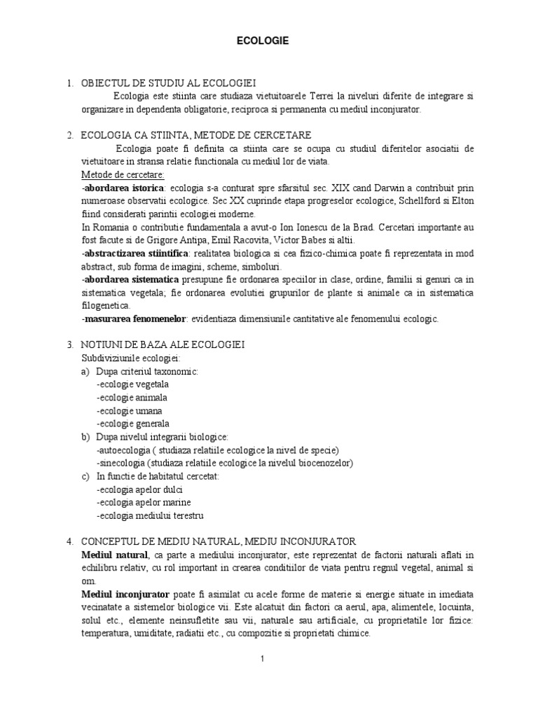 1. OBIECTUL DE STUDIU AL ECOLOGIEI Ecologia este stiinta care studiaza vietuitoarele Terrei la niveluri diferite de integrare si organizare in dependenta obligatorie, reciproca si permanenta cu mediul inconjurator. 2. ECOLOGIA CA STIINTA, METODE DE CERCETARE Ecologia poate fi definita ca stiinta care se ocupa cu studiul diferitelor asociatii de vietuitoare in stransa relatie functionala cu mediul lor de viata. Metode de cercetare: -abordarea istorica: ecologia s-a conturat spre sfarsitul sec. XIX cand Darwin a contribuit prin numeroase observatii ecologice. Sec XX cuprinde etapa progreselor ecologice, Schellford si Elton fiind considerati parintii ecologiei moderne. In Romania o contributie fundamentala a avut-o Ion Ionescu de la Brad. Cercetari importante au fost facute si de Grigore Antipa, Emil Racovita, Victor Babes si altii. -abstractizarea stiintifica: realitatea biologica si cea fizico-chimica poate fi reprezentata in mod abstract, sub forma de imagini, scheme, simboluri. -abordarea sistematica presupune fie ordonarea speciilor in clase, ordine, familii si genuri ca in sistematica vegetala; fie ordonarea evolutiei grupurilor de plante si animale ca in sistematica filogenetica. -masurarea fenomenelor: evidentiaza dimensiunile cantitative ale fenomenului ecologic. 3. NOTIUNI DE BAZA ALE ECOLOGIEI Subdiviziunile ecologiei: a) Dupa criteriul taxonomic: -ecologie vegetala -ecologie animala -ecologie umana -ecologie generala b) Dupa nivelul integrarii biologice: -autoecologia ( studiaza relatiile ecologice la nivel de specie) -sinecologia (studiaza relatiile ecologice la nivelul biocenozelor) c) In functie de habitatul cercetat: -ecologia apelor dulci -ecologia apelor marine -ecologia mediului terestru 4. CONCEPTUL DE MEDIU NATURAL, MEDIU INCONJURATOR Mediul natural, ca parte a mediului inconjurator, este reprezentat de factorii naturali aflati in echilibru relativ, cu rol important in crearea conditiilor de viata pentru regnul vegetal, animal si om. Mediul inconjurator poate fi asimilat cu acele forme de materie si energie situate in imediata vecinatate a sistemelor biologice vii. Este alcatuit din factori ca aerul, apa, alimentele, locuinta, solul etc., elemente neinsufletite sau vii, naturale sau artificiale, cu proprietatile lor fizice: temperatura, umiditate, radiatii etc., cu compozitie si proprietati chimice.