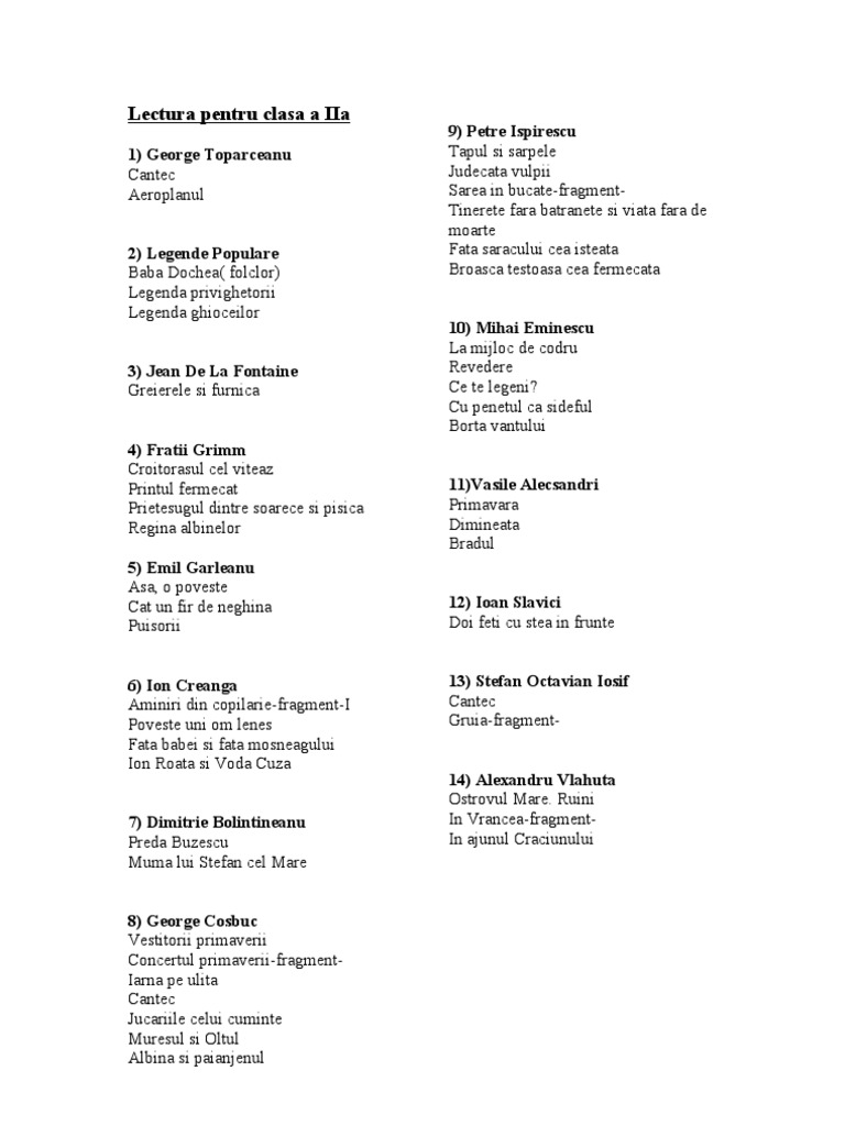 1) George Toparceanu Cantec Aeroplanul 2) Legende Populare Baba Dochea( folclor) Legenda privighetorii Legenda ghioceilor 3) Jean De La Fontaine Greierele si furnica 4) Fratii Grimm Croitorasul cel viteaz Printul fermecat Prietesugul dintre soarece si pisica Regina albinelor 5) Emil Garleanu Asa, o poveste Cat un fir de neghina Puisorii 6) Ion Creanga Aminiri din copilarie-fragment-I Poveste uni om lenes Fata babei si fata mosneagului Ion Roata si Voda Cuza 7) Dimitrie Bolintineanu Preda Buzescu Muma lui Stefan cel Mare 8) George Cosbuc Vestitorii primaverii Concertul primaverii-fragmentIarna pe ulita Cantec Jucariile celui cuminte Muresul si Oltul Albina si paianjenul