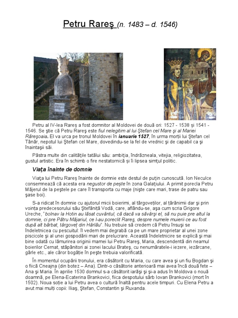 Petru al IV-lea Rare a fost domnitor al Moldovei de dou ori: 1527 - 1538 i 1541 1546. Se tie c Petru Rare este fiul nelegitim al lui tefan cel Mare i al Mariei Rreoaia. El va urca pe tronul Moldovei n ianuarie 1527, n urma morii lui tefan cel Tnr, nepotul lui tefan cel Mare, dovedindu-se la fel de vrednic i de capabil ca i naintaii si. Pstra multe din calitile tatlui su: ambiia, ndrzneala, vitejia, religiozitatea, gustul artistic. Era n schimb o fire nestatornic i i lipsea simul politic.