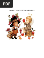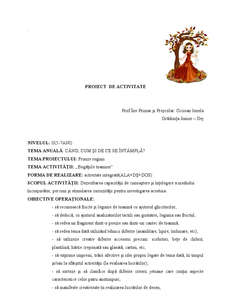 NIVELUL: II(5-7ANI) TEMA ANUAL: CND, CUM I DE CE SE NTMPL? TEMA PROIECTULUI: Frunze ruginii TEMA ACTIVITII: ,,Bogiile toamnei FORMA DE REALIZARE: activitate integrat(ALA+D+DOS) SCOPUL ACTIVITII: Dezvoltarea capacitii de cunoatere i nelegere a mediului nconjurtor, percum i stimularea curiozitii pentru investigarea acestuia. OBIECTIVE OPERAIONALE: - s recunoasc fructe i legume de toamn cu ajutorul ghicitorilor; - s deduc, cu ajutorul analizatorilot tactili sau gustativi, leguma sau fructul; - s redea un fragment dintr-o poezie sau dintr-un cantec de toamn; - s redea tema dat utiliznd tehnici diferite (asamblare, lipire, mbinare, etc); - s utilizeze creativ diferite accesorii precum: scobitori, bee de chibrit, plastilin, hrtie creponat sau glasat, carton, etc; - s exprime impresii, triri afective i idei proprii legate de tema dat, n timpul i/sau la sfritul activitii (la evaluarea lucrrilor); - s sorteze i s clasifice dup diferite criterii jetoane care conin aspecte caracteristice celor patru anotimpuri; - s manifeste creativitate n realizarea lucrrilor de desen;