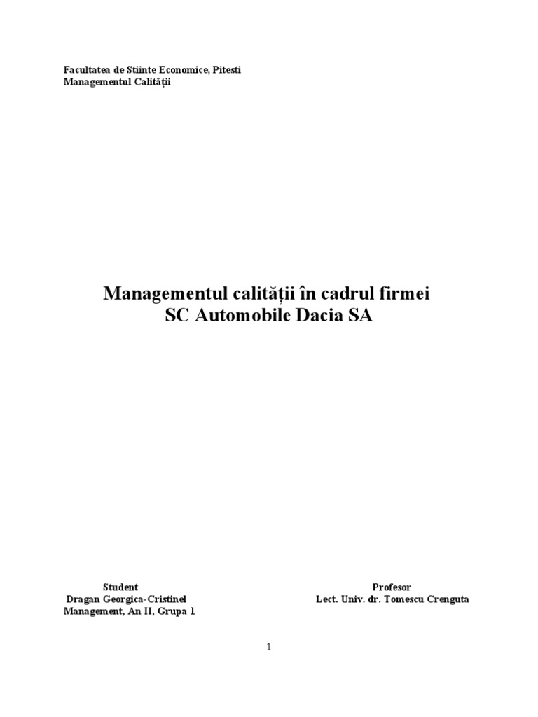 CUPRINS Generalitati.3 Implementarea sistemului calittii....5 Prezentarea firmei11 Manualul Calitatii in cadrul firmei SC Automobile Dacia SA31 Resurse umane in cadrul firmei SC Automobile Dacia SA..59 Analiza SWOT..60 Concluzii....61 Bibliografie62