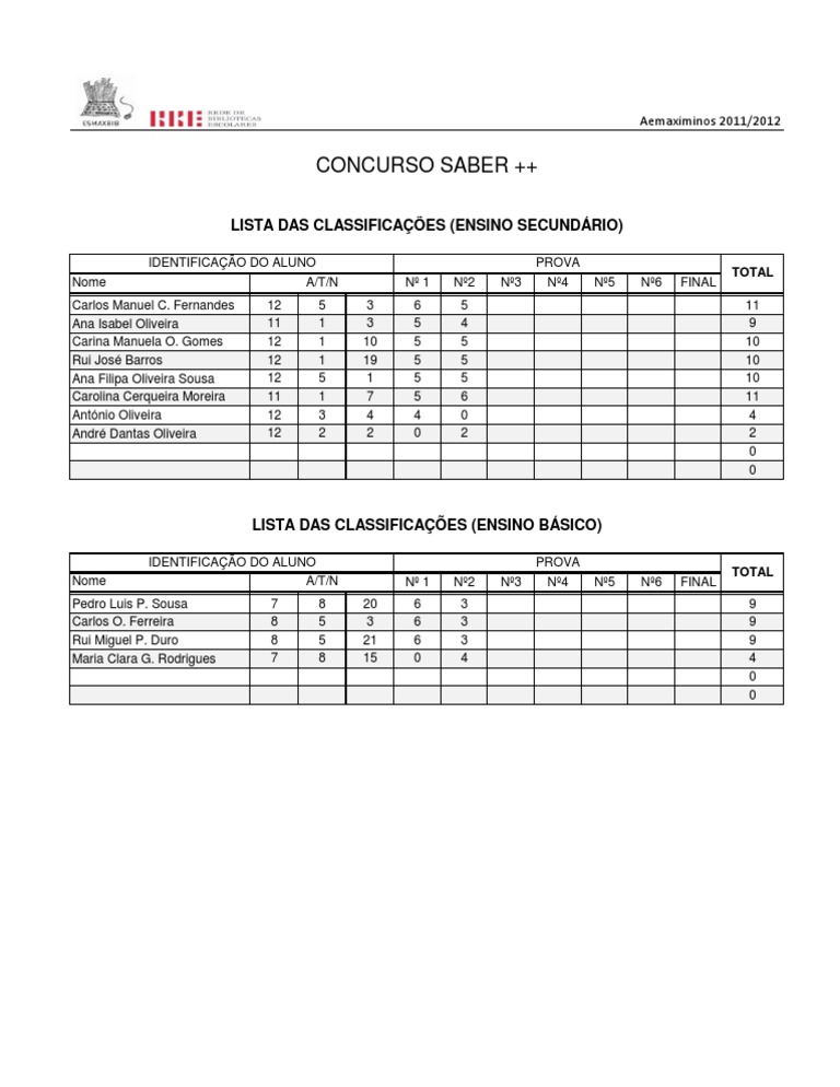 IDENTIFICAO DO ALUNO Nome Carlos Manuel C. Fernandes Ana Isabel Oliveira Carina Manuela O. Gomes Rui Jos Barros Ana Filipa Oliveira Sousa Carolina Cerqueira Moreira Antnio Oliveira Andr Dantas Oliveira 12 11 12 12 12 11 12 12 A/T/N 5 1 1 1 5 1 3 2 3 3 10 19 1 7 4 2 N 1 6 5 5 5 5 5 4 0 N2 5 4 5 5 5 6 0 2 N3 PROVA N4 N5 N6 FINAL TOTAL 11 9 10 10 10 11 4 2 0 0