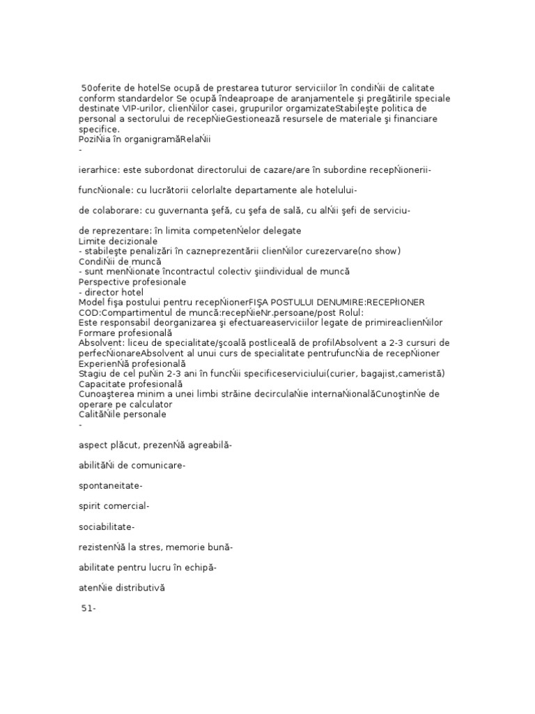 seriozitate, onestitate, dinamism,eficien Responsabiliti( atribuii, lucrri, sarcini) Promoveaz i vinde servicii hotelierePregtete i realizeaz primirea clienilor Asigur exploatarea judicioas a camerelor Informeaz clientulRezolv solicitrile, reclamaiile, situaiile specialePoate avea atribuii legate de rezervarea spaiilor de cazare, de facturare i ncasare acontravalorilorii consumurilor Poziia n organigramRelaii ierahice: este subordonat efului de recepiefuncionale: cu celelalte compartimente a hoteluluide colaborare: cu lucrtorii concierge, rezervri, casieriede reprezentare: n limita competenelor delegate Limite dicizionale - refuz cazarea turitilor aflai pe lista neagr Condiii de munc - menionate n contractulcolectiv i individual demunc Perspective profesionale: ef de recepiedirector recepie Model fia postului pentru cameristFIA POSTULUI DENUMIRE:CAMERISTCOD:Comportimentul de munc:etajNr.persoane/post Rolul: Efectuarea activitii dentreinere i curenie baspaiilor de cazare Formarea profesional coala profesionalabsolvent a unor cursuri de perfecionare n domeniu Experien profesional-Capacitatea profesional Cunoaterea unei limbi strine de circulaieinternaional Calitile personale sim gospodresceficien n muncdexteritateperseveren, responsabilitatesim al detaliuluiacuitate vizual, memorie bundiscreie, cinste, corectitudineresponsabilitate