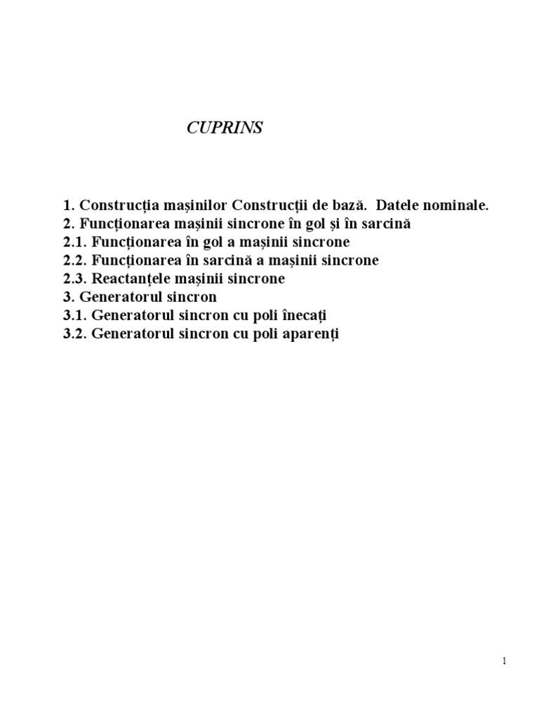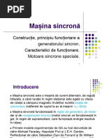 1. Construcia mainilor Construcii de baz. Datele nominale. 2. Funcionarea mainii sincrone n gol i n sarcin 2.1. Funcionarea n gol a mainii sincrone 2.2. Funcionarea n sarcin a mainii sincrone 2.3. Reactanele mainii sincrone 3. Generatorul sincron 3.1. Generatorul sincron cu poli necai 3.2. Generatorul sincron cu poli apareni