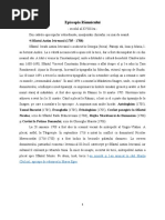 7. Miron Cristea (1920-1925): fost episcop de Caransebe (1909-1919), participant la Marea Adunare Naional de la Alba Iulia, ajuns apoi cel dinti patriarh al Romniei rentregite (1925-1939). EPISCOPIA RMNICULUI Episcopia Rmnicului a fost arhipstorit n aceast perioad de opt ierarhi: Atanasie Stoenescu (1873-1880), Iosif Bobulescu (1880-1886), Ghenadie Enceanu (1886-1898), Athanasie Mironescu (1898-1909), Ghenadie Georgescu (1909-1912), Sofronie Vulpescu (1913-1918) i Antim Petrescu (1918). Cel mai important a fost Ghenadie Enceanu, fost profesor la Seminarul Central din Bucureti, apoi la Seminarul Nifon, iar din 1881 la Facultatea din Bucureti, redactor al revistei Biserica Ortodox Romn i apoi director al Tipografiei Crilor Bisericeti. El a rmas cunoscut pentru activitatea cultural, ntocmind i tiprind manuale didactice (Principii de Filosofie, Istoria Filosofiei, Patristica) i lucrri istorice (Cretinismul n Dacii i cretinarea romnilor, Petru Movil, Istoria mnstirii Sinaia, O vizit canonic n anul 1889, Vizite canonice nsoite de note istoricoarheologice n anii 1890-1891); a editat Condica Sfnt a Mitropoliei Ungrovlahiei. EPISCOPIA BUZULUI Episcopia Buzului a fost arhipstorit n aceast perioad de trei ierarhi: Dionisie Romano (1865-1873), Inochentie Chiulescu (1873-1893) i Dionisie Climescu (1894-1921); ntre 1893-1894 a administrat locotenentul episcopal Valerian tefnescu. Cel mai important ierarh a fost Dionisie Romano, considerat un adevrat pionier al unitii statale romneti, dat fiind faptul c s-a nscut n Transilvania (la Slitea Sibiului) i a activat, ca ieromonah, stare i apoi ierarh, n Moldova i n ara Romneasc. S-a clugrit la Neam, activnd nti ca tipograf la Bucureti. ntre 1832-1843 a fost profesor naional la Buzu i revizor colar, calitate n care a cerut interzicerea btii n coal i a introdus carnetul de coresponden cu prinii. A ntocmit i a tiprit cteva manuale (Abecedar romnesc, Abecedar religios) i a iniiat colecia literal Biblioteca tinerilor nceptori. mpreun cu profesorul Gavriil Munteanu a pus bazele primei gazete religioase romneti: Vestitorul Bisericesc de la Buzu (1839-1840). ntre 1843-1848 a predat la Seminarul Central din Bucureti. Participnd apoi activ la Revoluia din 1848-1849, a fost arestat la Vcreti, fiind nevoit s se retrag, dup eliberare, n Transilvania. A revenit la Bucureti n 1850, ntemeind ziarul Eho ecleziatic (1850-1852), ce avea ca supliment Biblioteca religios moral. n 22