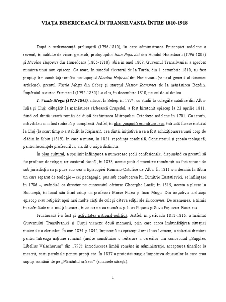 nfiinat numeroase coli confesionale, o tipografie i o librrie bisericeasc (1885) i a iniiat apariia gazetei eparhiale Foaia Diecezen (1886-1948) 2. Nicolae Popea (1889-1908): originar din Satulung (BV), cu studii de drept la Cluj i teologice la Viena, fost profesor la Institutul teologic din Sibiu, respectiv vicar i participant, n calitate de cpitan, la Revoluia din 1848-1849. A fost ales ulterior deputat n Dieta Transilvaniei i membru n Senatul imperial de la Viena. Ca episcop, a ridicat o cldire pentru Institutul teologicpedagogic (1891) i s-a opus ncercrilor de maghiarizare a nvmntului romnesc. n plan editorial, a ntocmit mai multe lucrri: Vechea Mitropolie Ortodox Romn a Transilvaniei, Arhiepiscopul i Mitropolitul Andrei baron de aguna i Memorialul mitropolitului Andrei aguna. A fost ales membru al Academiei Romne. n anii 1908-1909, la intervenia Guvernului maghiar, mpratul Francisc Iosif I a invalidat dou alegeri succesive de ierarhi la Caransebe, fcute n cadrul sinodului eparhial: Filaret Musta i Iosif-Traian Badescu; abia la a treia ntrunire s-a acceptat un nou ierarh: Miron Cristea. 3. Miron Cristea (1909-1919): a iniiat o colect pentru satele afectate de inundaii, a ctitorit mnstirea de la Romneti (jud. Timi) azi i poart numele: Izvorul (lui) Miron i a participat la Marea Adunare Naional de la Alba din 1 Decembrie 1918, ducnd apoi la Bucureti actul de adeziune a romnilor ardeleni i bneni la Unirea cu Romnia.