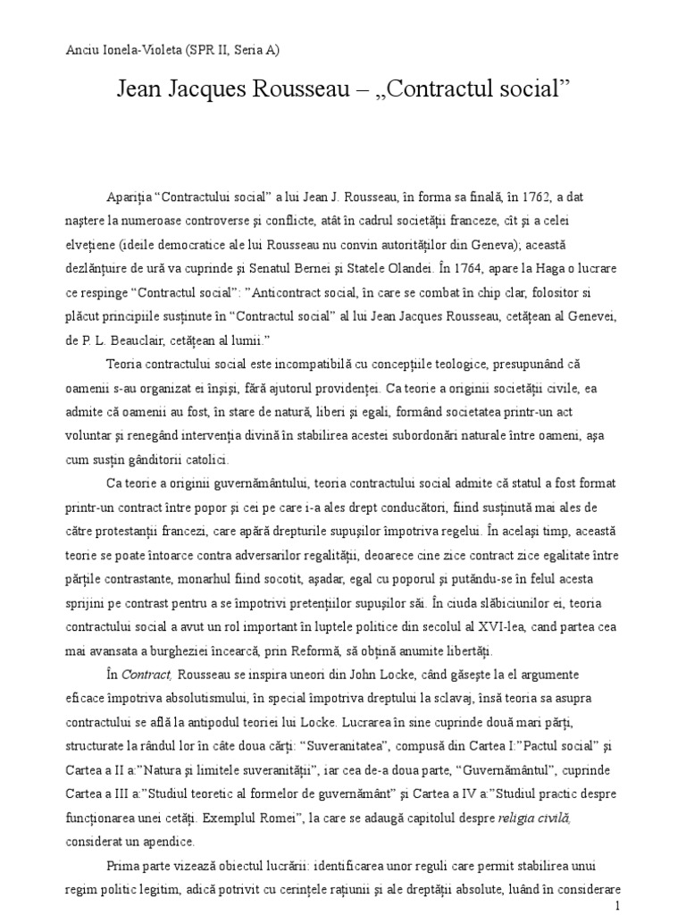 Anciu Ionela-Violeta (SPR II, Seria A) dou scopuri principale: libertatea i egalitatea, ns mai important dect legile este stabilirea unor bune moravuri.11 Guvernmntul nu este dect puterea executiv, acea putere distinct de puterea legiuitoare care aparine principelui, iar efii nu sunt dect slujiorii suveranului. Orice confuzie ntre puterea legiuitoare i cea executiv constituie o violare a pactului social. Nu exist form de guvernmnt care s fie, prin ea nsi, cea mai bun din toate; ele trebuie s varieze de la stat la stat.12 Rousseau identifica patru forme de guvernmnt: democraia (este forma de guvernmnt n care poporul este n acelai timp i suveran i principe, iar primejdia cea mare este ca legile i actele de guvernmnt s nu se confunde; este forma ideal, ns ea nu a existat niciodat n stare pur),13 aristocraia (care poate fi natural, ereditar sau electiv), monarhia (este guvernmntul cel mai puternic, dar se transform inevitabil n despotism) i guvernmintele mixte, care sunt foarte variate i ngduie s se stabileasc cel mai bine fora relativ a guvernmntului.14 Orice guvernmnt tinde n mod inevitabil s degenereze, spunea Rousseau; el se restrnge nencetat: de la democraie se ajunge la oligarhie, de aici la monarhie i n final se ajunge la despotism, deoarece guvernmintele au mereu tendina de a confisca libertatea, iar acest lucru nu poate fi remediat dect prin adunri frecvente ale poporului, care trebuie nencetat s pun n discuie problema formei de guvernmnt i alegerea celor care guverneaz.15 [Link] afirma n cel de-al patrulea capitol al lucrarii sale c ntr-un stat mic, n care se duce o viata simpl, voina general este ntotdeauna limpede, iar aceasta continu s existe chiar dac moravurile slbesc, fiind ascuns de interesele particulare.16 El adaug ulterior n capitolul despre religia civil, c estist trei tipuri de religii: religiile particulare unor anumite tipuri de popoare, precum religiile antice, religii ale omului, cum e cea a Evangheliei i religii sacerdotale, care introduc n fiecare popor un al doilea suveran, unde ofer drept exemplu catolicismul roman. Este important s se stabileasc o religie ale crei dogme s reglementeze opiniile cetenilor n msura n care ele intereseaza comunitatea. Aadar, Rousseau visa o societate democratic ntemeiat pe raiune. Contractul social exprim un ideal inc confuz, din cauza faptului c n acea perioad nu exista o metoda tiinific pentru studierea faptelor sociale. Dar el trebuie s fie scump tuturor oamenilor dornici de progres, pentru c idealul pe care a ncercat s-l exprime mai rmne s fie realizat n toat acea parte a lumii care este nc supus exploatrii capitaliste.