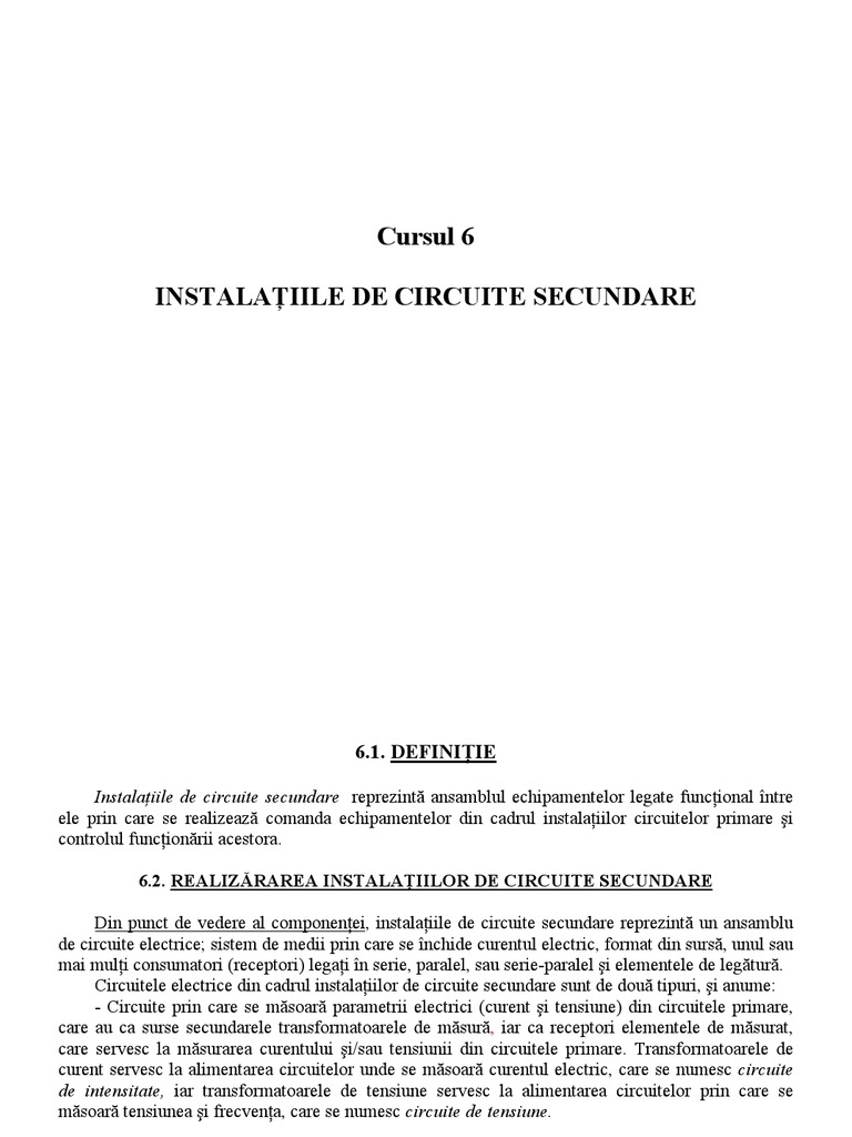 Instalaiile de circuite secundare reprezint ansamblul echipamentelor legate funcional ntre ele prin care se realizeaz comanda echipamentelor din cadrul instalaiilor circuitelor primare i controlul funcionrii acestora. 6.2. REALIZRAREA INSTALAIILOR DE CIRCUITE SECUNDARE Din punct de vedere al componenei, instalaiile de circuite secundare reprezint un ansamblu de circuite electrice; sistem de medii prin care se nchide curentul electric, format din surs, unul sau mai muli consumatori (receptori) legai n serie, paralel, sau serie-paralel i elementele de legtur. Circuitele electrice din cadrul instalaiilor de circuite secundare sunt de dou tipuri, i anume: - Circuite prin care se msoar parametrii electrici (curent i tensiune) din circuitele primare, care au ca surse secundarele transformatoarele de msur, iar ca receptori elementele de msurat, care servesc la msurarea curentului i/sau tensiunii din circuitele primare. Transformatoarele de curent servesc la alimentarea circuitelor unde se msoar curentul electric, care se numesc circuite de intensitate, iar transformatoarele de tensiune servesc la alimentarea circuitelor prin care se msoar tensiunea i frecvena, care se numesc circuite de tensiune.