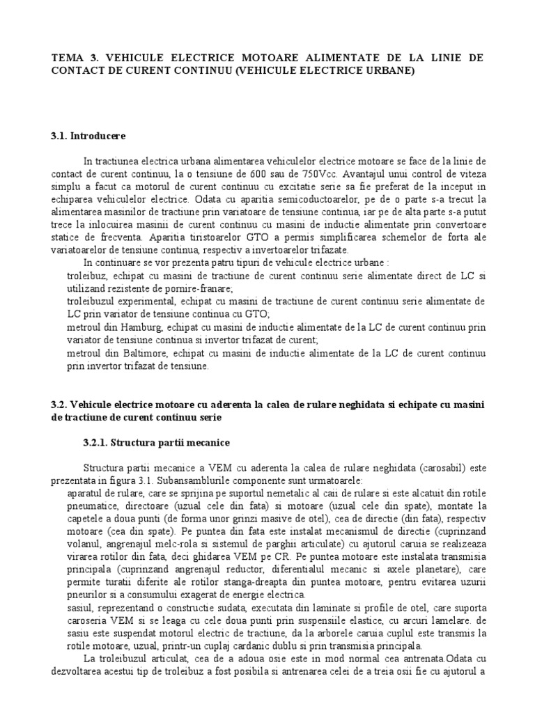 3.1. Introducere In tractiunea electrica urbana alimentarea vehiculelor electrice motoare se face de la linie de contact de curent continuu, la o tensiune de 600 sau de 750Vcc. Avantajul unui control de viteza simplu a facut ca motorul de curent continuu cu excitatie serie sa fie preferat de la inceput in echiparea vehiculelor electrice. Odata cu aparitia semicoductoarelor, pe de o parte s-a trecut la alimentarea masinilor de tractiune prin variatoare de tensiune continua, iar pe de alta parte s-a putut trece la inlocuirea masinii de curent continuu cu masini de inductie alimentate prin convertoare statice de frecventa. Aparitia tiristoarelor GTO a permis simplificarea schemelor de forta ale variatoarelor de tensiune continua, respectiv a invertoarelor trifazate. In continuare se vor prezenta patru tipuri de vehicule electrice urbane : troleibuz, echipat cu masini de tractiune de curent continuu serie alimentate direct de LC si utilizand rezistente de pornire-franare; troleibuzul experimental, echipat cu masini de tractiune de curent continuu serie alimentate de LC prin variator de tensiune continua cu GTO; metroul din Hamburg, echipat cu masini de inductie alimentate de la LC de curent continuu prin variator de tensiune continua si invertor trifazat de curent; metroul din Baltimore, echipat cu masini de inductie alimentate de la LC de curent continuu prin invertor trifazat de tensiune. 3.2. Vehicule electrice motoare cu aderenta la calea de rulare neghidata si echipate cu masini de tractiune de curent continuu serie 3.2.1. Structura partii mecanice Structura partii mecanice a VEM cu aderenta la calea de rulare neghidata (carosabil) este prezentata in figura 3.1. Subansamblurile componente sunt urmatoarele: aparatul de rulare, care se sprijina pe suportul nemetalic al caii de rulare si este alcatuit din rotile pneumatice, directoare (uzual cele din fata) si motoare (uzual cele din spate), montate la capetele a doua punti (de forma unor grinzi masive de otel), cea de directie (din fata), respectiv motoare (cea din spate). Pe puntea din fata este instalat mecanismul de directie (cuprinzand volanul, angrenajul melc-rola si sistemul de parghii articulate) cu ajutorul caruia se realizeaza virarea rotilor din fata, deci ghidarea VEM pe CR. Pe puntea motoare este instalata transmisia principala (cuprinzand angrenajul reductor, diferentialul mecanic si axele planetare), care permite turatii diferite ale rotilor stanga-dreapta din puntea motoare, pentru evitarea uzurii pneurilor si a consumului exagerat de energie electrica. sasiul, reprezentand o constructie sudata, executata din laminate si profile de otel, care suporta caroseria VEM si se leaga cu cele doua punti prin suspensiile elastice, cu arcuri lamelare. de sasiu este suspendat motorul electric de tractiune, da la arborele caruia cuplul este transmis la rotile motoare, uzual, printr-un cuplaj cardanic dublu si prin transmisia principala. La troleibuzul articulat, cea de a adoua osie este in mod normal cea [Link] cu dezvoltarea acestui tip de troleibuz a fost posibila si antrenarea celei de a treia osii fie cu ajutorul a