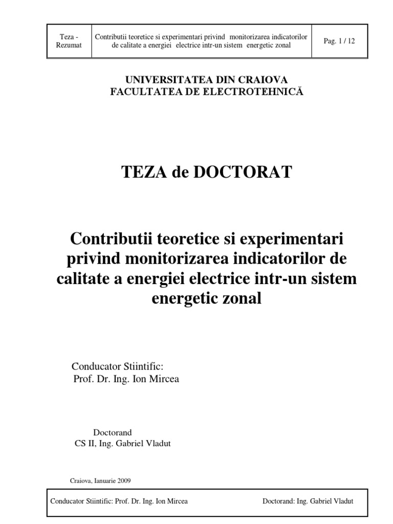 Contributii teoretice si experimentari privind monitorizarea indicatorilor de calitate a energiei electrice intr-un sistem energetic zonal