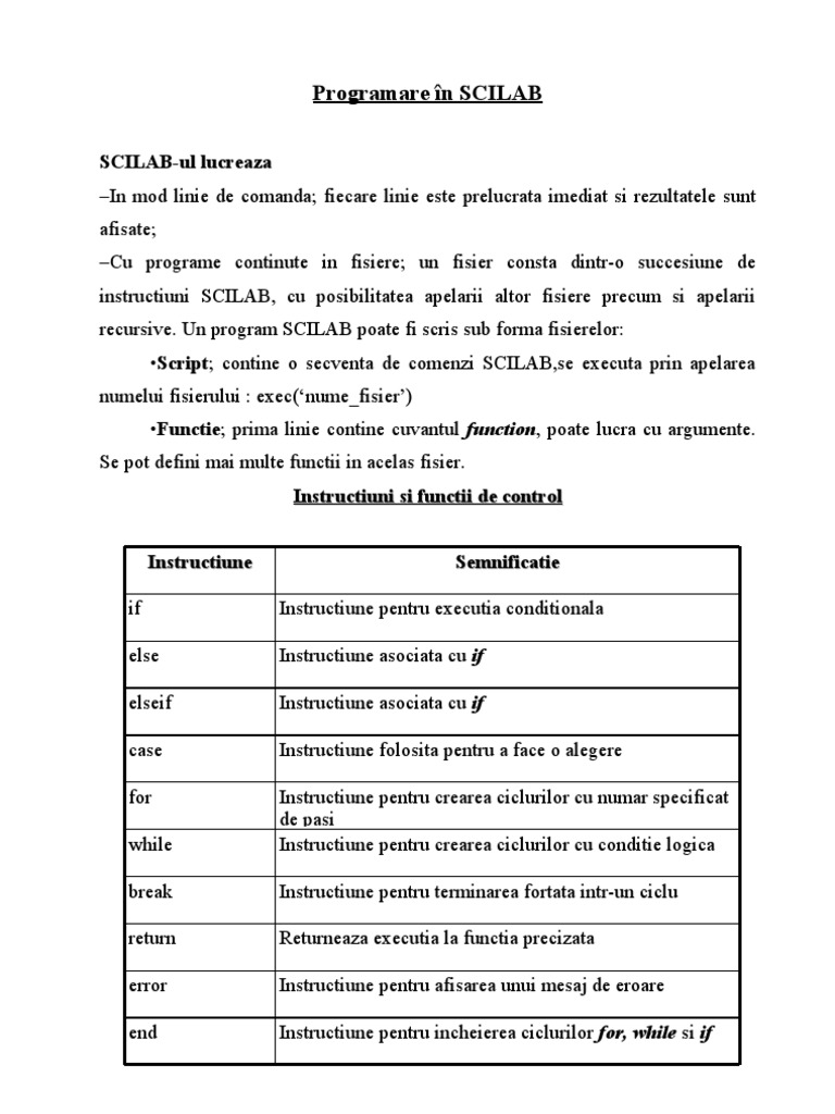 instructiuni SCILAB, cu posibilitatea apelarii altor fisiere precum si apelarii