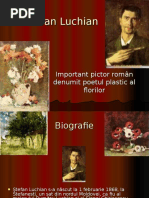 Date despre autor: tefan Luchian este pictorul care l-a facut pe Nicolae Grigorescu s exclame: n sfrit, am i eu un succesor! i pe care Iosif Iser l socotea cel mai romn dintre pictorii notri. Nscut la 1 februarie 1868, la Stefneti, un sat (astazi oras) in judeul Botoani, tefan Luchian a dominat pictura romneasc de la inceputul secolului al XX-lea, continund pe calea deschis de Grigorescu i Ion Andreescu. Farmecul simplu al peisajelor de pe malul Prutului i-a pus amprenta asupra biografiei lui Luchian, temperament dinamic, al crui elan exprimnd bucuria pe care o trezete contactul cu lumina pur a zilei, a fost frnt, prematur, in 1916. ntre 1885 si 1889, tefan Luchian a studiat la coala de Belle Arte din Bucureti, apoi la Munchen, unde, timp de un an, a fost student al Academiei Regale de Arte Frumoase. Si-a desvrit studiile la Academia Julian din Paris, intre 1891 si 1892. Inc din 1892, Luchian se afirma ca unul dintre cei mai valoroi pictori din epoc, expunnd la societatea Tinerimea artistic, al crei scop era dezvoltarea artei dincolo de conveniile academice. Anul 1896 marcheaz Expoziia artitilor independei, organizat in ar, mpreun cu ali colegi de breasl. Doi ani mai trziu, este membru fondator al societaii artistice Ileana. Luchian devine n scurt timp una dintre cele mai interesante personaliti artistice ale artei romneti, primul pictor romn modern, care a sintetizat n mod original unele tendine artistice ale timpului su, ntr-o oper aflat sub semnul contemporaneitii. Luchian reprezint reacia cea mai puternic mpotriva tendinelor semntoriste, n arta sa pictorii romni descoperind ndemnul pentru culoare i sintez constructiv. Modernitatea pe care tefan Luchian o aduce n pictura romneasc este cel mai bine surprins n nelegerea pe care artistul o acord raportului dintre artist i natur. Pictura nu este pentru el mijlocul de reproducere mimetic a naturii, ci un proces de cunoatere a acesteia i de autocunoatere, n ultim instan. Convertind natura n sinteze liniare i acorduri cromatice strlucitoare, Luchian exprim spiritul su liric, precum i calitile sale de mare colorist. Picturile cu flori, unul dintre cele mai bogate capitole ale operei sale, sunt cele n care se realizeaz desvrirea miestriei artistului, considerat
