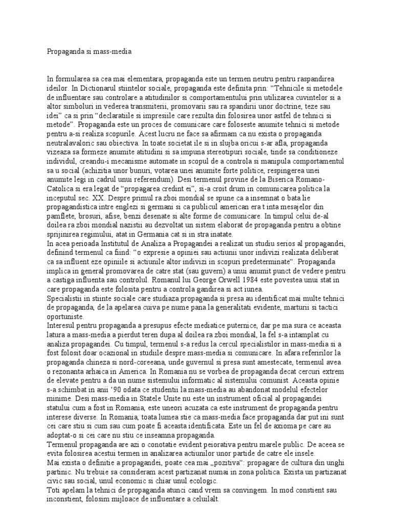 In Dictionarul stiintelor sociale, propaganda este definita prin: Tehnicile si metodele de influentare sau controlare a atitudinilor si comportamentului prin utilizarea cuvintelor si a altor simboluri in vederea transmiterii, promovarii sau ra spandirii unor doctrine, teze sau idei ca si prin declaratiile si impresiile care rezulta din folosirea unor astfel de tehnici si metode. Propaganda este un proces de comunicare care foloseste anumite tehnici si metode pentru a-si realiza scopurile. Acest lucru ne face sa afirmam ca nu exista o propaganda neutralavaloric sau obiectiva. In toate societat ile si in slujba oricui s-ar afla, propaganda vizeaza sa formeze anumite atitudini si sa impuna stereotipuri sociale, tinde sa conditioneze individul, creandu-i mecanisme automate in scopul de a controla si manipula comportamentul sa u social (achizitia unor bunuri, votarea unei anumite forte politice, respingerea unei anumite legi in cadrul unui referendum). Desi termenul provine de la Biserica RomanoCatolica si era legat de propagarea credint ei, si-a croit drum in comunicarea politica la inceputul sec. XX. Despre primul ra zboi mondial se spune ca a insemnat o bata lie propagandistica intre englezi si germani si ca publicul american era t inta mesajelor din pamflete, brosuri, afise, benzi desenate si alte forme de comunicare. In timpul celui de-al doilea ra zboi mondial nazistii au dezvoltat un sistem elaborat de propaganda pentru a obtine sprijinirea regimului, atat in Germania cat si in stra inatate. In acea perioada Institutul de Analiza a Propagandei a realizat un studiu serios al propagandei, definind termenul ca fiind: o expresie a opiniei sau actiunii unor indivizi realizata deliberat ca sa influent eze opiniile si actiunile altor indivizi in scopuri predeterminate. Propaganda implica in general promovarea de catre stat (sau guvern) a unui anumit punct de vedere pentru a castiga influenta sau controlul. Romanul lui George Orwell 1984 este povestea unui stat in care propaganda este folosita pentru a controla gandirea si act iunea. Specialistii in stiinte sociale care studiaza propaganda si presa au identificat mai multe tehnici de propaganda, de la apelarea cuiva pe nume pana la generalitati evidente, marturii si tactici oportuniste. Interesul pentru propaganda a presupus efecte mediatice puternice, dar pe ma sura ce aceasta latura a mass-media a pierdut teren dupa al doilea ra zboi mondial, la fel s-a intamplat cu analiza propagandei. Cu timpul, termenul s-a redus la cercul specialistilor in mass-media si a fost folosit doar ocazional in studiile despre mass-media si comunicare. In afara referirilor la propaganda chineza si nord-coreeana, unde guvernul si presa sunt amestecate, termenul avea o rezonanta arhaica in America. In Romania nu se vorbea de propaganda decat cercuri extrem de elevate pentru a da un nume sistemului informatic al sistemului comunist. Aceasta opinie s-a schimbat in anii 90 odata ce studentii la mass-media au abandonat modelul efectelor minime. Desi mass-media in Statele Unite nu este un instrument oficial al propagandei statului cum a fost in Romania, este uneori acuzata ca este instrument de propaganda pentru interese diverse. In Romania, toata lumea stie ca mass-media face propaganda dar put ini sunt cei care stiu si cum sau cum poate fi aceasta identificata. Este un fel de axioma pe care au adoptat-o si cei care nu stiu ce inseamna propaganda. Termenul propaganda are azi o conotatie evident peiorativa pentru marele public. De aceea se evita folosirea acestui termen in analizarea actiunilor unor partide de catre ele insele. Mai exista o definitie a propagandei, poate cea mai pozitiva: propagare de cultura din unghi partinic. Nu trebuie sa consideram acest partizanat numai in zona politica. Exista un partizanat civic sau social, unul economic si chiar unul ecologic. Toti apelam la tehnici de propaganda atunci cand vrem sa convingem. In mod constient sau inconstient, folosim mijloace de influentare a celuilalt.