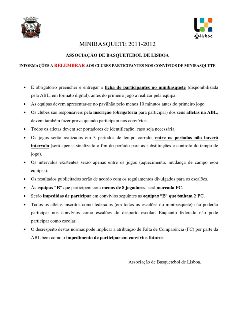 obrigatrio preencher e entregar a ficha de participantes no minibasquete (disponibilizada pela ABL, em formato digital), antes do primeiro jogo a realizar pela equipa. As equipas devem apresentar-se no pavilho pelo menos 10 minutos antes do primeiro jogo. Os clubes so responsveis pela inscrio (obrigatria para participar) dos seus atletas na ABL, devem tambm fazer prova quando participam nos convvios. Todos os atletas devem ser portadores de identificao, caso seja necessria. Os jogos sero realizados em 3 perodos de tempo corrido, entre os perodos no haver intervalo (ser apenas sinalizado o fim do perodo para as substituies e controlo do tempo de jogo).
