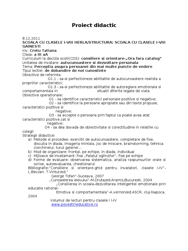 8.12.2011 SCOALA CU CLASELE I-VIII HERLA/STRUCTURA: SCOALA CU CLASELE I-VIII GAINESTI Inv. Cretu Tatiana Clasa: a III aA Curriculum la decizia scolii(CDS): consiliere si orientare-Ora fara catalog Unitatea de invatare: autocunoastere si dezvoltare personala Tema: Perceptia asupra persoanei din mai multe puncte de vedere Tipul lectiei: de dobandire de noi cunostinte Obiective de referinta: O1.1 - sa-si perfectioneze abilitatile de autocunoastere realista a propriilor caracteristici; O1.3 - sa-si perfectioneze abilitatile de autoreglare emotionala si comportamentala in situatii situatii diferite legate de viata Obiective operationale: O1 - sa identifice caracteristici personale pozitive si negative; O2 - sa identifice la persoane apropiate sau din texte propuse, caracteristici pozitive si negative; O3 - sa accepte o persoana prin faptul ca poate avea atat caracteristici pozitive,cat si negative; O4 - sa dea dovada de obiectivitate si corectitudine in relatiile cu colegii Strategii didactice: a) Metode si procedee: exercitii de autocunoastere, completare de fise, discutia in diada, imageria mintala, joc de miscare, brainstorming, tehnica ciorchinelui, turul galeriei... b) Mod de organizare: frontal, pe echipe, in diada, individual c) Mijloace de invatamant: fisa Palatul oglinzilor, fise pe echipe d) Forme de evaluare: observarea sistematica, analiza raspunsurilor orale si scrise, autoevaluarea, chestionarul Bibliografie:Consiliere si orientare-ghid pentru invatatori, clasele [Link]. [Link]/ed. George Tofan-Suceava, 2007 Cunoasterea [Link]/[Link],Bucuresti, 2004 Consilierea in scoala-dezvoltarea inteligentei emotionale prin educatie rationalEmotiva si [Link]/[Link], cluj-Napoca, 2004 Volumul de lecturi pentru clasele I I-IV [Link]