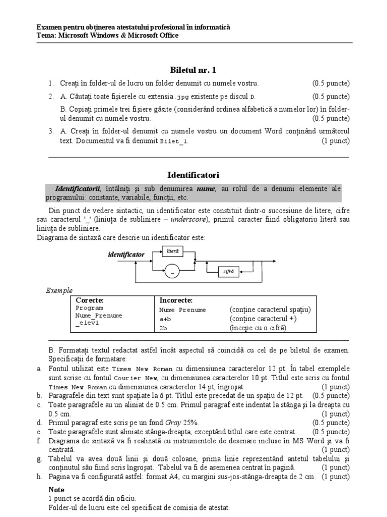 (conine caracterul spaiu) (conine caracterul +) (ncepe cu o cifr) _____________________________________________________________________________ B. Formatai textul redactat astfel nct aspectul s coincid cu cel de pe biletul de examen. Specificaii de formatare: Fontul utilizat este Times New Roman cu dimensiunea caracterelor 12 pt. n tabel exemplele sunt scrise cu fontul Courier New, cu dimensiunea caracterelor 10 pt. Titlul este scris cu fontul Times New Roman cu dimensiunea caracterelor 14 pt, ngroat. (1 punct) Paragrafele din text sunt spaiate la 6 pt. Titlul este precedat de un spaiu de 12 pt. (0.5 puncte) Toate paragrafele au un aliniat de 0.5 cm. Primul paragraf este indentat la stnga i la dreapta cu 0.5 cm. (1 punct) Primul paragraf este scris pe un fond Gray 25%. (0.5 puncte) Toate paragrafele sunt aliniate stnga-dreapta, exceptnd titlul care este centrat. (0.5 puncte) Diagrama de sintax va fi realizat cu instrumentele de desenare incluse n MS Word i va fi centrat. (1 punct) Tabelul va avea dou linii i dou coloane, prima linie reprezentnd antetul tabelului i coninutul su fiind scris ngroat. Tabelul va fi de asemenea centrat n pagin. (1 punct) Pagina va fi configurat astfel: format A4, cu margini sus-jos-stnga-dreapta de 2 cm. (1 punct) Note 1 punct se acord din oficiu. Folder-ul de lucru este cel specificat de comisia de atestat.