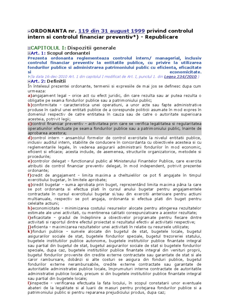 119 din 31 august 1999 privind controlul intern si controlul financiar preventiv*) - Republicare