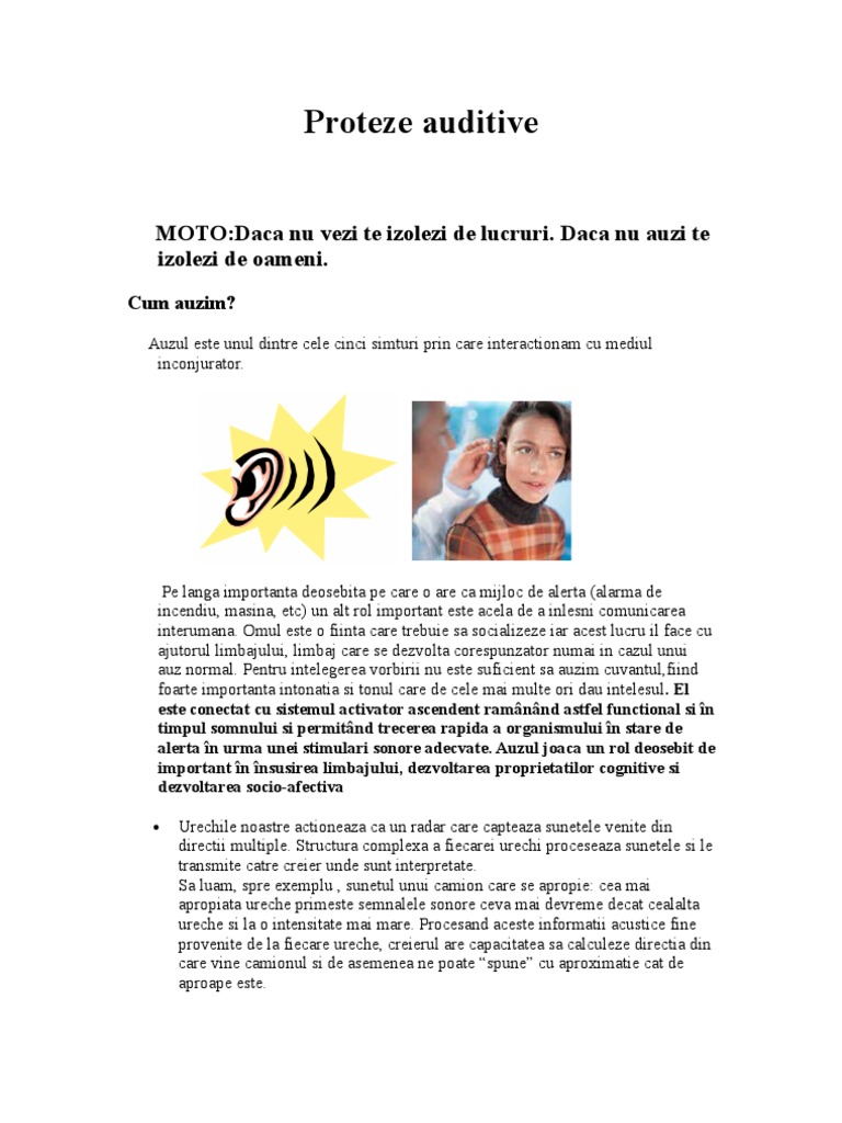 Protezarea auditiva este un demers extrem de pretentios si de [Link] principiu proteza acustica realizeaza o supleanta senzoriala deoarece repararea senzoriala este imposibila. Asadar o proteza auditiva trebuie sa aiba in vedere 3 obiective:reabilitarea organului distrus,schimbarea naturii stimulului auditiv,si concretizarea stimulului. Pentru realizarea acestora,fiecare proteza acustica moderna trebuie sa aibe in structura ei urmatoarele segmente:segmentul de intrare,de amplificare,de iesire si dispozitivul de alimentare cu [Link] fundamental al protezei este sa amplifice [Link] anumite defectiuni care afecteaza sistemul de transmisie cum ar fi distorsiunile sau zgomotul de fond, o proteza auditiva este in mod unic si in intregime caracterizata prin posibilitatile ei de amplificare reprezentate in ultima instanta prin sunetul castigat. O proteza auditiva are 3 parti de baza:microfon amplificator si [Link] receptioneaza sunetul in microfon unde transmite semnalele sonore in unde electrice si le trimite apoi [Link] creste puterea semnalului iar acesta trimite urechii printr-un difuzor.