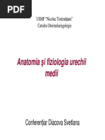 Urechea medie este alctuit din casa timpanului mpreun cu lanul osicular (ciocanul, nicovala i scria) i anexele acestuia: trompa Eustachio i sistemul celular mastoidian. - Casa timpanului este o cavitate aerian interpus ntre urechea extern i cea intern, traversat de lanul osicular. Este divizat n trei: recesul epitimpanic (atica), mezotimpanul i recesul hipotimpanic. Atica se continu cu antrul mastoidian printr-o poriune mai ngust. Multiplele formaiuni care despart atica de mezotimpan, pot favoriza o aerare defectuoas pentru aceasta, cu retenia secreiilor n inflamaii. Recesul hipotimpanic este n raport cu golful venei jugulare. - Membrana timpanic formeaz peretele lateral al casei fiind constituit din pars tensa i pars falccida, avnd n structur cinci straturi histologice: epiodermic, epitelial extern, lamina propria, epitelial intern i mucos. - Peretele intern alctuit din baza stncii temporalului are ca repere importante: promotoriul, fereastra vestibular, fereastra timpanic i sinus tzmpani. - Mucoasa care cptuete cavitile urechii medii este de tip pseudostratificat ciliat n jurul orificiului trompei Eustachio i epiteliu cubic stratificat, n rest, cu celule mucoase i glande submucoase. - Trompa EUstachio face legtura ntre urechea medie i rinofaringe. La adult, cele dou treimi anterioare sunt cartilaginoase, iar treimea posterioar este osoas, iar la sugar, poriunea osoas reprezint mai mult de jumtate din lungimea trompei. Mecanismul de deschidere al trompei este muscular. Muchiul peristafilin extern realizeaz prin contracie deschiderea activ a trompei. nchiderea trompei cartilaginoase ncepe la captul su istmic posteroextern i progreseaz spre captul antero-intern.