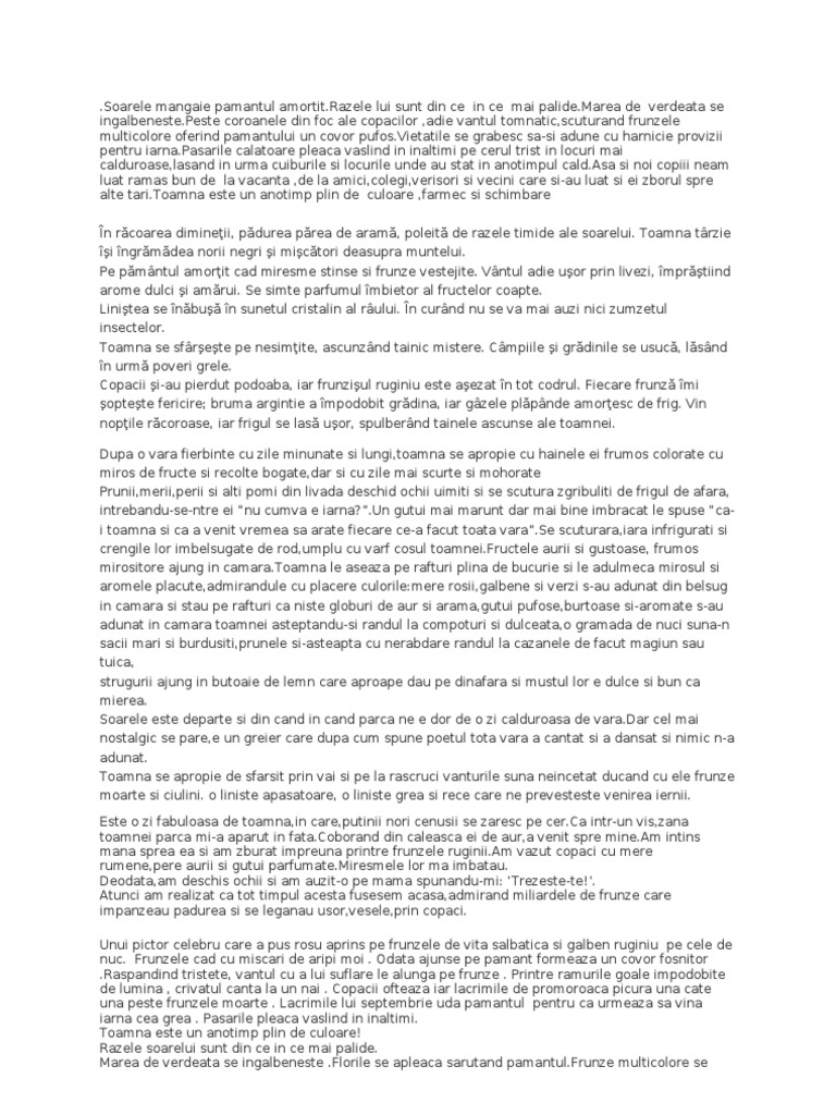 Peste coroanele din foc ale copacilor ,adie vantul tomnatic,scuturand frunzele multicolore oferind pamantului un covor [Link] se grabesc sa-si adune cu harnicie provizii pentru [Link] calatoare pleaca vaslind in inaltimi pe cerul trist in locuri mai calduroase,lasand in urma cuiburile si locurile unde au stat in anotimpul [Link] si noi copiii neam luat ramas bun de la vacanta ,de la amici,colegi,verisori si vecini care si-au luat si ei zborul spre alte [Link] este un anotimp plin de culoare ,farmec si schimbare n rcoarea dimineii, pdurea prea de aram, poleit de razele timide ale soarelui. Toamna trzie i ngrmdea norii negri i mictori deasupra muntelui. Pe pmntul amorit cad miresme stinse si frunze vestejite. Vntul adie uor prin livezi, mprtiind arome dulci i amrui. Se simte parfumul mbietor al fructelor coapte. Linitea se nbu n sunetul cristalin al rului. n curnd nu se va mai auzi nici zumzetul insectelor. Toamna se sfrete pe nesimite, ascunznd tainic mistere. Cmpiile i grdinile se usuc, lsnd n urm poveri grele. Copacii i-au pierdut podoaba, iar frunziul ruginiu este aezat n tot codrul. Fiecare frunz mi optete fericire; bruma argintie a mpodobit grdina, iar gzele plpnde amoresc de frig. Vin nopile rcoroase, iar frigul se las uor, spulbernd tainele ascunse ale toamnei. Dupa o vara fierbinte cu zile minunate si lungi,toamna se apropie cu hainele ei frumos colorate cu miros de fructe si recolte bogate,dar si cu zile mai scurte si mohorate Prunii,merii,perii si alti pomi din livada deschid ochii uimiti si se scutura zgribuliti de frigul de afara, intrebandu-se-ntre ei nu cumva e iarna?.Un gutui mai marunt dar mai bine imbracat le spuse cai toamna si ca a venit vremea sa arate fiecare ce-a facut toata [Link] scuturara,iara infrigurati si crengile lor imbelsugate de rod,umplu cu varf cosul [Link] aurii si gustoase, frumos mirositore ajung in [Link] le aseaza pe rafturi plina de bucurie si le adulmeca mirosul si aromele placute,admirandule cu placere culorile:mere rosii,galbene si verzi s-au adunat din belsug in camara si stau pe rafturi ca niste globuri de aur si arama,gutui pufose,burtoase si-aromate s-au adunat in camara toamnei asteptandu-si randul la compoturi si dulceata,o gramada de nuci suna-n sacii mari si burdusiti,prunele si-asteapta cu nerabdare randul la cazanele de facut magiun sau tuica, strugurii ajung in butoaie de lemn care aproape dau pe dinafara si mustul lor e dulce si bun ca mierea. Soarele este departe si din cand in cand parca ne e dor de o zi calduroasa de [Link] cel mai nostalgic se pare,e un greier care dupa cum spune poetul tota vara a cantat si a dansat si nimic n-a adunat. Toamna se apropie de sfarsit prin vai si pe la rascruci vanturile suna neincetat ducand cu ele frunze moarte si ciulini. o liniste apasatoare, o liniste grea si rece care ne prevesteste venirea iernii. Este o zi fabuloasa de toamna,in care,putinii nori cenusii se zaresc pe [Link] intr-un vis,zana toamnei parca mi-a aparut in [Link] din caleasca ei de aur,a venit spre [Link] intins mana sprea ea si am zburat impreuna printre frunzele [Link] vazut copaci cu mere rumene,pere aurii si gutui [Link] lor ma imbatau. Deodata,am deschis ochii si am auzit-o pe mama spunandu-mi: Trezeste-te!. Atunci am realizat ca tot timpul acesta fusesem acasa,admirand miliardele de frunze care impanzeau padurea si se leganau usor,vesele,prin copaci. Unui pictor celebru care a pus rosu aprins pe frunzele de vita salbatica si galben ruginiu pe cele de nuc. Frunzele cad cu miscari de aripi moi . Odata ajunse pe pamant formeaza un covor fosnitor .Raspandind tristete, vantul cu a lui suflare le alunga pe frunze . Printre ramurile goale impodobite de lumina , crivatul canta la un nai . Copacii ofteaza iar lacrimile de promoroaca picura una cate una peste frunzele moarte . Lacrimile lui septembrie uda pamantul pentru ca urmeaza sa vina iarna cea grea . Pasarile pleaca vaslind in inaltimi. Toamna este un anotimp plin de culoare! Razele soarelui sunt din ce in ce mai palide. Marea de verdeata se ingalbeneste .Florile se apleaca sarutand [Link] multicolore se