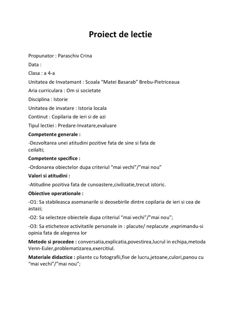 Propunator : Paraschiv Crina Data : Clasa : a 4-a Unitatea de Invatamant : Scoala Matei Basarab Brebu-Pietriceaua Aria curriculara : Om si societate Disciplina : Istorie Unitatea de invatare : Istoria locala Continut : Copilaria de ieri si de azi Tipul lectiei : Predare-Invatare,evaluare Competente generale : -Dezvoltarea unei atitudini pozitive fata de sine si fata de ceilalti; Competente specifice : -Ordonarea obiectelor dupa criteriul mai vechi / mai nou Valori si atitudini : -Atitudine pozitiva fata de cunoastere,civilizatie,trecut istoric. Obiective operationale : -O1: Sa stabileasca asemanarile si deosebirile dintre copilaria de ieri si cea de astazi; -O2: Sa selecteze obiectele dupa criteriul mai vechi / mai nou ; -O3: Sa eticheteze activitatile personale in : placute/ neplacute ,exprimandu-si opinia fata de alegerea lor Metode si procedee : conversatia,explicatia,povestirea,lucrul in echipa,metoda Venn-Euler,problematizarea,exercitiul. Materiale didactice : pliante cu fotografii,fise de lucru,jetoane,culori,panou cu mai vechi / mai nou ;