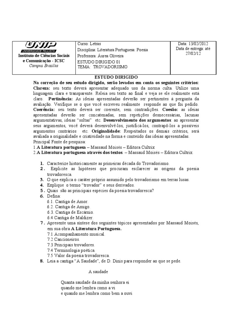 ESTUDO DIRIGIDO Na correo de seu estudo dirigido, sero levados em conta os seguintes critrios: Clareza: seu texto dever apresentar adequado uso da norma culta. Utilize uma linguagem clara e transparente. Releia seu texto ao final e veja se ele realmente est claro. Pertinncia: As ideias apresentadas devero ser pertinentes pergunta da avaliao. Verifique se o que voc escreveu realmente responde ao que foi pedido. Coerncia: seu texto dever ser coerente, sem contradies. Coeso: as ideias apresentadas devero ser concatenadas, sem repeties desnecessrias, lacunas argumentativas, ideias soltas etc. Desenvolvimento dos argumentos: ao apresentar seus argumentos, voc dever desenvolv-los, justific-los, contrap-los a possveis argumentos contrrios etc. Originalidade: Respeitados os demais critrios, ser avaliada a originalidade e criatividade na forma e contedo das ideias apresentadas. Principal Fonte de pesquisa: 1.A Literatura portuguesa Massaud Moiss Editora Cultrix 2.A Literatura portuguesa atravs dos textos. Massaud Moiss Editora Cultrix. 1. Caracterize historicamente as primeiras dcada do Trovadorismo. 2. Explicite as hipteses que procuram esclarecer as origens da poesia trovadoresca. 3. O que explica o carter prprio assumido pelo trovadorismo em terras lusas. 4. Explique o termo trovador e seus derivados. 5. Quais so as principais espcies da poesia trovadoresca? 6. Defina: 6.1. Cantiga de Amor. 6.2. Cantiga de Amigo. 6.3. Cantiga de Escrnio. 6.4 Cantiga de Maldizer. 7. Apresente uma sntese dos seguintes tpicos apresentados por Massaud Moiss, em sua obra A Literatura Portuguesa. 7.1 Acompanhamento musical. 7.2 Cancioneiros. 7.3 Principais trovadores. 7.4 Terminologia potica. 7.5 Valor da poesia trovadoresca. 8. Leia a cantiga A Saudade, de D. Dinis para responder ao que se pede. A saudade Quanta saudade da minha senhora ei quando me lembra como a vi e quando me lembra como bem a ouvi