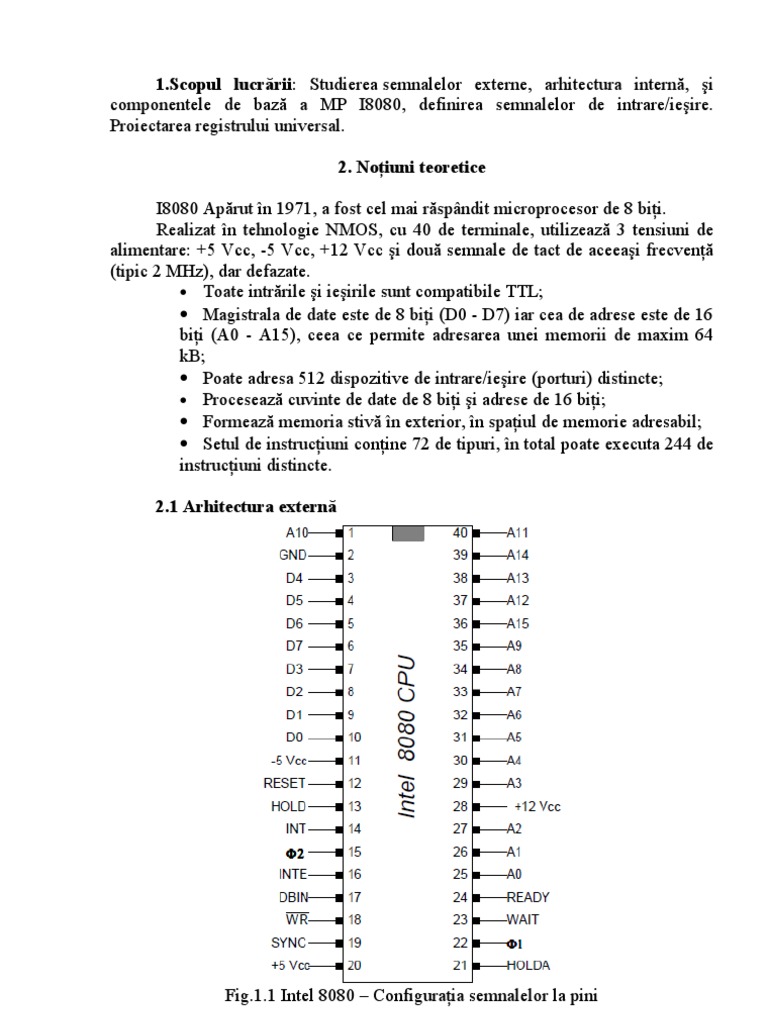 Proiectarea registrului universal. 2. Noiuni teoretice I8080 Aprut n 1971, a fost cel mai rspndit microprocesor de 8 bii. Realizat n tehnologie NMOS, cu 40 de terminale, utilizeaz 3 tensiuni de alimentare: +5 Vcc, -5 Vcc, +12 Vcc i dou semnale de tact de aceeai frecven (tipic 2 MHz), dar defazate. Toate intrrile i ieirile sunt compatibile TTL; Magistrala de date este de 8 bii (D0 - D7) iar cea de adrese este de 16 bii (A0 - A15), ceea ce permite adresarea unei memorii de maxim 64 kB; Poate adresa 512 dispozitive de intrare/ieire (porturi) distincte; Proceseaz cuvinte de date de 8 bii i adrese de 16 bii; Formeaz memoria stiv n exterior, n spaiul de memorie adresabil; Setul de instruciuni conine 72 de tipuri, n total poate executa 244 de instruciuni distincte. 2.1 Arhitectura extern