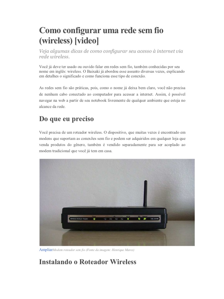 realizando uma pesquisa na web pela marca e modelo do seu roteador voc encontra inmeros sites e fruns bem conceituados que ensinam nos mnimos detalhes as configuraes. urar redes sem fio