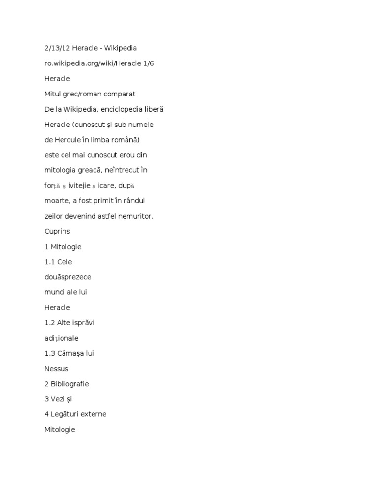 org/wiki/Heracle 1/6 Heracle Mitul grec/roman comparat De la Wikipedia, enciclopedia liber Heracle (cunoscut i sub numele de Hercule n limba romn) este cel mai cunoscut erou din mitologia greac, nentrecut n for ivitejie icare, dup moarte, a fost primit n rndul zeilor devenind astfel nemuritor. Cuprins 1 Mitologie 1.1 Cele dousprezece munci ale lui Heracle 1.2 Alte isprvi adiionale 1.3 Cmaa lui Nessus 2 Bibliografie 3 Vezi i 4 Legturi externe Mitologie