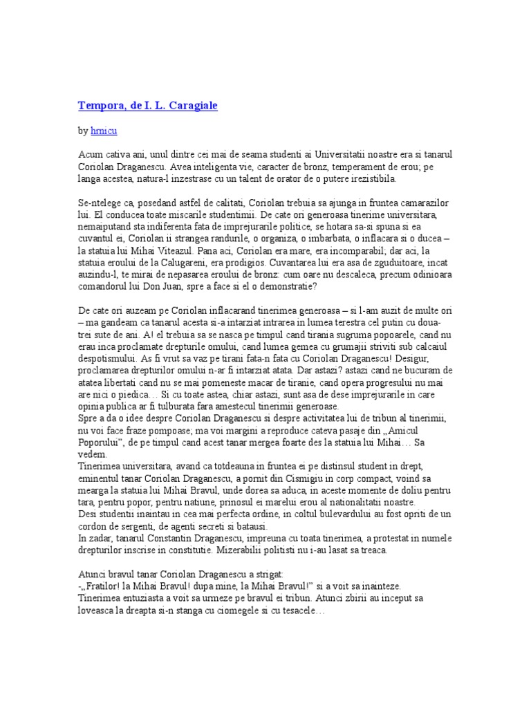 Apoi: Tanarul Coriolan Draganescu, bravul student, care se afla in fruntea tinerimii universitare aseara pe bulevard a fost arestat de catre banditii politiei. El se afla tinut la secret, fara sa poata comunica nici cu parintii. Se crede ca a fost lovit grav si torturat in arest; pentru aceea, mizerabilul jude, rusinea magistraturii, al carui nume ne facem o datorie de pudoare a nu-l mai pomeni in coloanele noastre, nu permite nimanui a da ochi cu tanara victima a acestui regim de teroare! Si alta: Guvernul a-nnebunit! Mizerabilii isi fac de cap! Aseara, pe cand studentimea, adunata la statuia lui Mihai Bravul, asculta cu inima incordata, cu sufletul transportat, patrioticul si magistralul discurs al tanarului si eminentului student Coriolan Draganescu, asupra dreptului ce-l are poporul de a protesta contra guvernului banditesc, politia a dat navala asupra acelora care vor fi maine fala tarii si, lovind, zdrobind, zdrelind orbeste, si-a facut loc pana la statuia eroului de pe treapta careia vorbea oratorul. A fost o scena de teroare de nedescris. La vederea agentilor avinati, care voiau sa puna mana pe el, tanarul Coriolan s-a suit repede pe statuie, si-ntr-o clipa a fost in picioare pe coapsa calului, de unde a strigat: Fie toata lumea martora la aceasta noua infamie a celui mai infam dintre regimuri! Dar banditii l-au apucat de picioare. Atunci bravul tanar a luat pe la spate in brate trupul lui Mihal Bravul si s-a inclestat de el cu putere. Banditii il trageau de picioare asa de tare, incat, daca tanarul nu ceda si nu lasa pe Mihai Bravul din brate, atunci ori ar fi frant trupul de bronz al eroului, ori acele fiare salbatice, i-ar fi smuls picioarele din incheieturi. Nu! nu! acest guvern a-nnebunit! Acesta era Coriolan Draganescu Si cu toata prodigioasa lui activitate de tribun politic, el nu si-a neglijat studiile decat foarte putin. A frecventat regulat cursurile la Universitate sapte-opt ani, si nu cu putina bucurie, parintii, rudele si numerosii sai amici au citit intr-o zi in Amicul Poporului urmatoarea notita la ultimele informatiuni: Aflam cu deosebita placere ca tanarul Coriolan Draganescu, eminentul student al Universitatii noastre, si-a sustinut cu succes teza de licenta in drept tratand cu talent despre Ordinea publica in Statul modern. Eminentul tanar a fost viu felicitat de membrii comisiei. Din parte-ne, ne facem de datorie a-l felicita asemenea, dorindu-i stralucita cariera pe care desigur cu talentele sale o merita. Licentia in drept! tanar eminent! iresistibil orator! caracter mare! idei generoase! Desigur, mi-am zis eu, iata un cetatean de mare viitor. Frumoasa cariera! Il avusesem totdeauna in vedere pe eminentul tanar. Ispravile lui ca student erau asa de zgomotoase, incat mai in fiecare zi trebuia sa auz, sa citesc sau sa pomenesc de acest frumos nume, Coriolan Draganescu! Parca a fost un facut Dupa ce am citit notita despre obtinerea licentei lui in drept, incet-incet am inceput sa uit de numele altadata atat de celebru, si era firesc lucru sa-l uit fiindca nu mai ma-mpiedicam de el la tot pasul. De mult acum il uitasem de tot. Era timpul turbure. Chestiuni politice acute; criza economica, agricola, finantiara; calcari mai mult sau mai putin grave ale pactului fundamental toate acestea iritasera mult opinia publica. Studentimea era in fierbere si pusese de gand sa manifesteze.