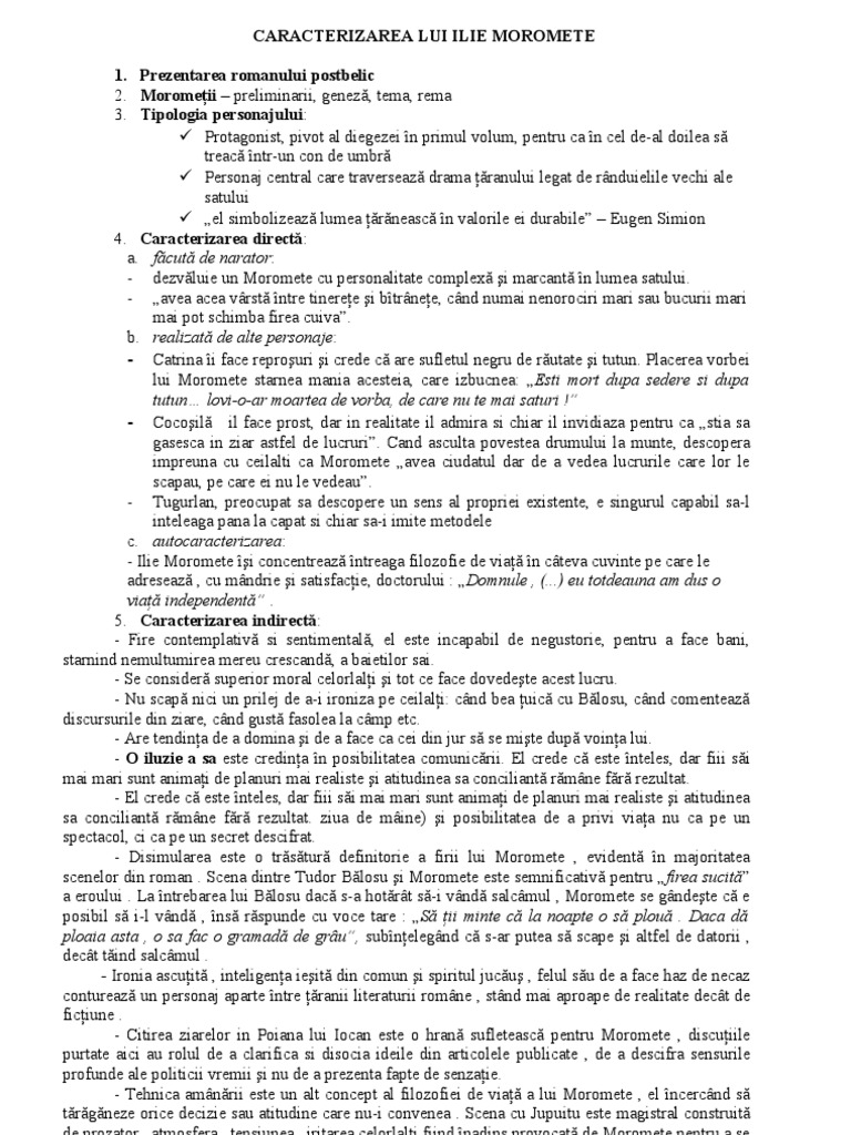 . Tipologia personajului: Protagonist, pivot al diegezei n primul volum, pentru ca n cel de-al doilea s treac ntr-un con de umbr Personaj central care traverseaz drama ranului legat de rnduielile vechi ale satului el simbolizeaz lumea rneasc n valorile ei durabile Eugen Simion 4. Caracterizarea direct: a. fcut de narator: - dezvluie un Moromete cu personalitate complex i marcant n lumea satului. - avea acea vrst ntre tineree i btrnee, cnd numai nenorociri mari sau bucurii mari mai pot schimba firea cuiva. b. realizat de alte personaje: - Catrina i face reprouri i crede c are sufletul negru de rutate i tutun. Placerea vorbei lui Moromete starnea mania acesteia, care izbucnea: Esti mort dupa sedere si dupa tutun lovi-o-ar moartea de vorba, de care nu te mai saturi ! - Cocoil il face prost, dar in realitate il admira si chiar il invidiaza pentru ca stia sa gasesca in ziar astfel de lucruri. Cand asculta povestea drumului la munte, descopera impreuna cu ceilalti ca Moromete avea ciudatul dar de a vedea lucrurile care lor le scapau, pe care ei nu le vedeau. - Tugurlan, preocupat sa descopere un sens al propriei existente, e singurul capabil sa-l inteleaga pana la capat si chiar sa-i imite metodele c. autocaracterizarea: - Ilie Moromete i concentreaz ntreaga filozofie de via n cteva cuvinte pe care le adreseaz , cu mndrie i satisfacie, doctorului : Domnule , (...) eu totdeauna am dus o via independent . 5. Caracterizarea indirect: - Fire contemplativ si sentimental, el este incapabil de negustorie, pentru a face bani, starnind nemultumirea mereu crescand, a baietilor sai. - Se consider superior moral celorlali i tot ce face dovedete acest lucru. - Nu scap nici un prilej de a-i ironiza pe ceilali: cnd bea uic cu Blosu, cnd comenteaz discursurile din ziare, cnd gust fasolea la cmp etc. - Are tendina de a domina i de a face ca cei din jur s se mite dup voina lui. - O iluzie a sa este credina n posibilitatea comunicrii. El crede c este nteles, dar fiii si mai mari sunt animai de planuri mai realiste i atitudinea sa conciliant rmne fr rezultat. - El crede c este nteles, dar fiii si mai mari sunt animai de planuri mai realiste i atitudinea sa conciliant rmne fr rezultat. ziua de mine) i posibilitatea de a privi viaa nu ca pe un spectacol, ci ca pe un secret descifrat. - Disimularea este o trstur definitorie a firii lui Moromete , evident n majoritatea scenelor din roman . Scena dintre Tudor Blosu i Moromete este semnificativ pentru firea sucit a eroului . La ntrebarea lui Blosu dac s-a hotrt s-i vnd salcmul , Moromete se gndete c e posibil s i-l vnd , ns rspunde cu voce tare : S ii minte c la noapte o s plou . Daca d ploaia asta , o sa fac o gramad de gru, subnelegnd c s-ar putea s scape i altfel de datorii , dect tind salcmul . - Ironia ascuit , inteligena ieit din comun i spiritul jucu , felul su de a face haz de necaz contureaz un personaj aparte ntre ranii literaturii romne , stnd mai aproape de realitate dect de ficiune . - Citirea ziarelor in Poiana lui Iocan este o hran sufleteasc pentru Moromete , discuiile purtate aici au rolul de a clarifica si disocia ideile din articolele publicate , de a descifra sensurile profunde ale politicii vremii i nu de a prezenta fapte de senzaie. - Tehnica amnrii este un alt concept al filozofiei de via a lui Moromete , el ncercnd s trgneze orice decizie sau atitudine care nu-i convenea . Scena cu Jupuitu este magistral construit de prozator , atmosfera , tensiunea , iritarea celorlali fiind nadins provocat de Moromete pentru a se rzbuna pe cei care nu nelegeau greutile bietului ran.