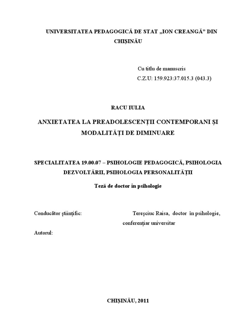 Racu Iulia. Anxietatea la preadolescenii contemporani i modaliti de diminuare. Tez de doctor n psihologie, Chiinu, 2011. Structura tezei: Teza cuprinde adnotrile, lista abrevierilor, introducere, trei capitole, concluzii generale i recomandri, bibliografie din 280 de titluri, 14 anexe, glosar i este perfectat pe 160 pagini, inclusiv 53 figuri i 13 tabele. Rezultatele obinute sunt publicate n 25 lucrri tiinifice. Cuvinte-cheie: anxietatea, tipurile anxietii, anxietatea colar, familia, statutul social, contiina de sine, autoaprecierea, nivelul de aspiraii, trsturi de personalitate, vrsta preadolescent. Domeniul de studiu: psihologie pedagogic, psihologia dezvoltrii, psihologia personalitii. Problema tiinific actual de importan major n domeniu soluionat. Cercetarea prezint studierea sistematic a portretului psihologic complex al preadolescentului anxios n scopul asigurrii procesului de dezvoltare armonioas a acestuia i ofer perspective noi n organizarea activitilor psihologice de lucru cu preadolescenii anxioi prin prisma elaborrii i realizrii programului de intervenii psihologice de diminuare a anxietii colare. Scopul lucrrii const n analiza dinamicii, specificului, tipurilor i surselor anxietii preadolescenilor din Republica Moldova, determinarea particularitilor de personalitate a preadolescenilor cu anxietate accentuat, proiectarea i implementarea programului complex de intervenie psihologic n vederea diminurii anxietii colare la copiii de 10 12 ani. Acest deziderat a fost realizat printr-un ir de obiective: studierea dinamicii i specificului anxietii pe parcursul vrstei preadolescente prin determinarea manifestrii anxietii i analiza comparativ a tipurilor de anxietate la preadolesceni de vrst diferit; stabilirea diferenelor de gen privind nivelul de anxietate la preadolesceni; studierea specificului anxietii colare i a factorilor determinani ai acesteia n preadolescen; identificarea surselor anxietii n preadolescen; stabilirea interrelaiei anxietate autoapreciere i anxietate nivel de aspiraii la preadolesceni; evidenierea deosebirilor n profilul psihologic al preadolescentului anxios i cel nonanxios; elaborarea i implementarea unui program complex de intervenii psihologice formative n vederea diminurii anxietii la copiii de 10 12 ani. Noutatea i originalitatea tiinific. Pentru prima dat n Republica Moldova este cercetat problema anxietii n preadolescen: este constat dinamica anxietii pe parcursul vrstei; sunt stabilite diferene de gen n manifestarea anxietii; s-au evideniat factorii determinani ai anxietii colare; s-au identificat sursele anxietii n preadolescen; au fost stabilite interdependene ntre anxietate i autoapreciere i anxietate i nivel de aspiraii; s-a reliefat un portret psihologic specific preadolescentului anxios; a fost elaborat i implementat programul complex de intervenie psihologic orientat spre diminuarea anxietii colare la preadolescenii de 10 12 ani; s-a evideniat c implementarea programului psihologic influeneaz pozitiv dezvoltarea emoional i cea a personalitii atenund anxietatea colar. Semnificaia teoretic i valoarea aplicativ lucrrii. Semnificaia epistemologic a lucrrii i are expresia n cercetarea tiinific a anxietii, a tipurilor anxietii, a factorilor determinani ai acesteia n preadolescen. Iar cea praxiologic const n posibilitatea aplicrii instrumentarului psihodiagnostic propus, a programului complex de intervenie psihologic i a rezultatelor cercetrii n lucrul psihologilor, profesorilor i prinilor cu preadolescenii anxioi. Programul psihologic complex de intervenie poate fi inclus n manualele i materialele instructive destinate psihologilor i cadrelor didactice din instituiile preuniversitare i poate constitui baza unui ghid metodologic pentru psihologi, asisteni sociali, profesori, prini, preadolesceni i toi cei preocupai de procesul educaional. Implementarea rezultatelor tiinifice. Teza constituie o contribuie temeinic la mbogirea literaturii tiinifice naionale n domeniul psihologiei i poate fi utilizat n procesul de pregtire i formare a psihologilor la facultile de psihologie din instituiile superioare de nvmnt, cutndu-i potenialii cititori n rndurile teoreticienilor, practicilor, studenilor, masteranzilor i doctoranzilor.