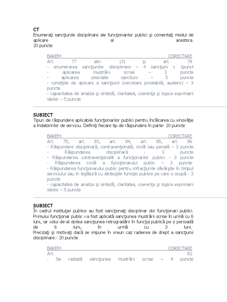 - Radiere mustrare scris - n termen de 6 luni de la aplicare 3 puncte Motivare prin efectul legii 4 puncte - Retrogradarea n funcia public pe o perioad de pn la un an se radiaz n termen de un an de la expirarea termenului pentru care a fost aplicat. 4 puncte - Capacitatea de analiza i sintez, claritatea, coerena i logica exprimarii ideilor 5 puncte SUBIECT Aplicarea sanciunilor disciplinare i competena aplicrii acestora, cu precizarea termenelor, condiiilor de aplicare i de [Link] un exemplu de sanciune disciplinar i precizai termenul de radiere a acesteia.- 20 puncte BAREM CORECTARE Art. 77 alin. (5), art. 78, art. 79 alin. (1) , art. 82 - identificarea termenului de aplicare a sanciunii 1 punct - identificarea modalitilor de aplicare: persoana care are competena numirii, la propunerea comisiei de disciplin 1 punct, direct de ctre conductor 1 punct - identificarea condiiilor de aplicare: cercetare prealabil 2 puncte, audiere funcionar public 2puncte, termenele de radiere 3 puncte - constatare prin act administrativ, cu excepia destituirii 2 puncte exemplul prezentat 3 puncte - capacitatea de analiza i sintez, claritatea, coerena i logica exprimarii ideilor 5 puncte SUBIECT Comentai situaiile n care este angajat rspunderea civil a funcionarului public.- 20 puncte BAREM CORECTARE - enumerarea situaiilor n care acesta se angajeaz 3 situaii x 2 p=6 puncte - enumerarea modalitilor prin care se dispune repararea pagubei.- 2x2p= 4 puncte precizarea termenului de 30 de zile 1 puncte - enunarea posibilitii funcionarului de a se adresa instanei de contencios.2 puncte - precizarea termenul de prescripie de 3 ani, a dreptului conductorului instituiei de a emite ordinului/dispoziiei de imputare de la data producerii pagubei.2 puncte