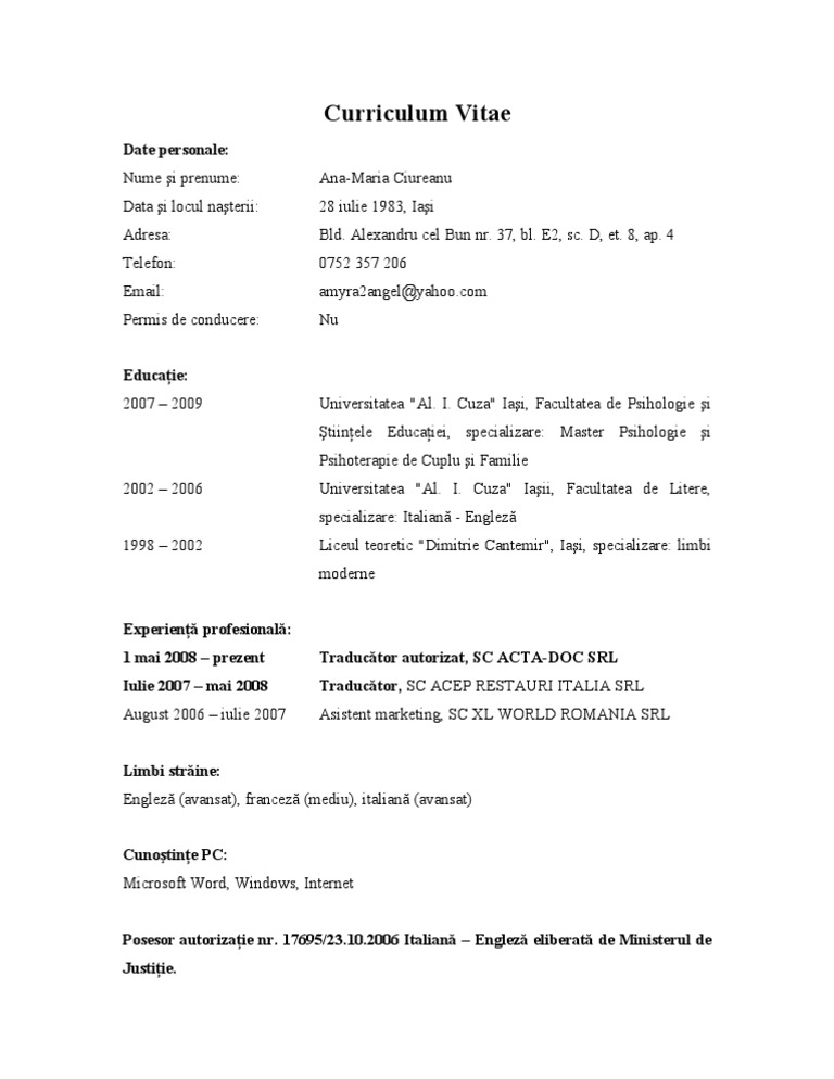 Date personale: Nume i prenume: Data i locul naterii: Adresa: Telefon: Email: Permis de conducere: Educaie: 2007 2009 Universitatea "Al. I. Cuza" Iai, Facultatea de Psihologie i tiinele Educaiei, specializare: Master Psihologie i Psihoterapie de Cuplu i Familie 2002 2006 1998 2002 Universitatea "Al. I. Cuza" Iaii, Facultatea de Litere, specializare: Italian - Englez Liceul teoretic "Dimitrie Cantemir", Iai, specializare: limbi moderne Experien profesional: 1 mai 2008 prezent Iulie 2007 mai 2008 August 2006 iulie 2007 Limbi strine: Englez (avansat), francez (mediu), italian (avansat) Cunotine PC: Microsoft Word, Windows, Internet Posesor autorizaie nr. 17695/23.10.2006 Italian Englez eliberat de Ministerul de Justiie. Traductor autorizat, SC ACTA-DOC SRL Traductor, SC ACEP RESTAURI ITALIA SRL Asistent marketing, SC XL WORLD ROMANIA SRL Ana-Maria Ciureanu 28 iulie 1983, Iai Bld. Alexandru cel Bun nr. 37, bl. E2, sc. D, et. 8, ap. 4 0752 357 206 amyra2angel@[Link] Nu