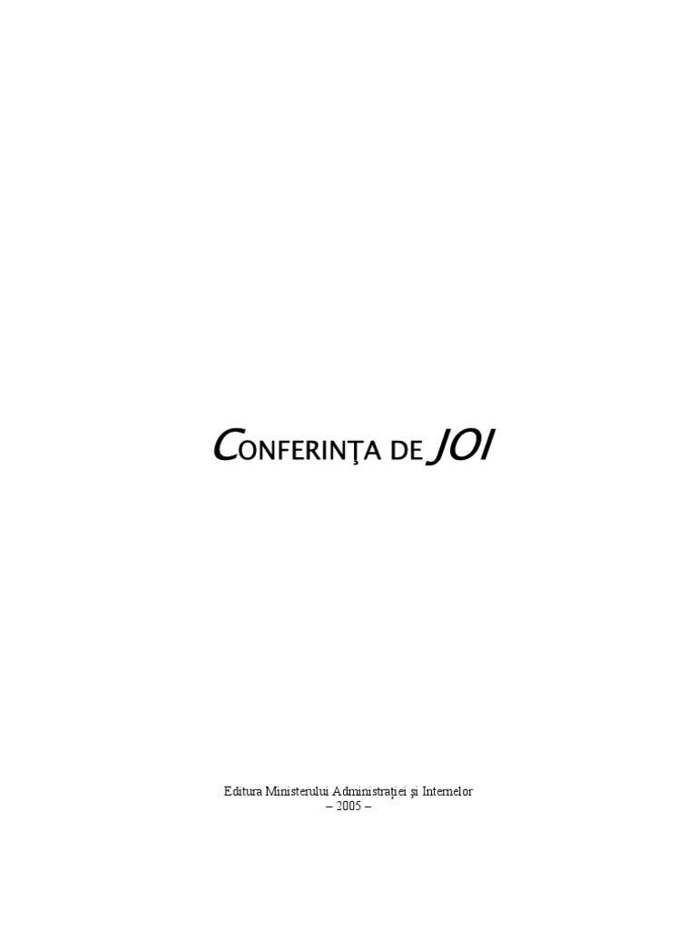 n comunicare, poate n mai mare msur dect n alte domenii, este mai important s conferi continuitate unui proiect, dect s l urmezi. Iar atunci cnd respectivul proiect prezint, deopotriv, interes pentru public i pentru organizatori, asigurarea continuitii n derularea acestuia este chiar vital. Este i cazul Conferinei de JOI aciune cultural i, n acelai timp, de relaii publice lansat la nceputul anului 2003 i care, n fiecare sptmn, joia, la ora 400 dup-amiaz, a transformat Centrul de pres al instituiei ntr-un generos Centru de dialog sub auspiciile temei unice Ministerul Administraiei i Internelor i societatea civil. tiina, artele, cultura, mass-media, sportul .a. au fost tot attea unghiuri din care distinse personaliti ale vieii publice romneti au susinut prelegeri n faa unui auditoriu format preponderent din tineri; iar schimburile de idei i opinii au constituit tot attea puni de legtur ntre realitatea culturii i cea a vieii cotidiene. Cu convingerea c fiecare ediie a Conferinei de JOI reprezint, n felul su, un eveniment, Direcia Informare i Relaii Publice a Ministerului Administraiei i Internelor a luat iniiativa tezaurizrii n volum a prelegerilor protagonitilor manifestrii, astfel nct zestrea ideilor exprimate s fie accesibil unui ct mai larg public. Un prim volum Conferina de JOI a aprut la nceputul anului 2004, purtnd ntre coperte substana celor 24 de ediii din anul 2003. n prefaa acelui prim volum, am promis c ne vom strdui ca seria editrii ciclului Conferina de JOI s continue. Iat c, prin lucrarea de fa strdaniile noastre prind, ntr-adevr, contur. Este un motiv de satisfacie i un prilej de a mulumi personalitilor vieii publice romneti care, n anul 2004, au onorat manifestarea, conferindu-i prestigiu: acad. Virgil Cndea, Cornel Codi, acad. Dimitrie Vatamaniuc, Gheorghe Dinic, Maria Georgescu, Mihaela Pene, acad. Augustin Buzura, Octavian Vintil, Georgeta Filitti, tefan Buchiu, Ilie Manole, Ion Murariu, Vasile Gheu, Iulian Fota, Titi Dinc, Alecu G. Croitoru, Cezar Ivnescu, Ion Horea, George Mihalcea, Cristian opescu, Geo Saizescu, Ana Tucicov-Bogdan, Ion Cristoiu, Ion Sideri, Ionel Durlea, acad. Marius Sala, Paulina Popoiu, Sorin Preda, Ion Ianoi, Cristiana-Suzana Glavce.