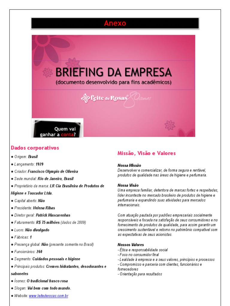 FRITZ, Monica; GOMES, Cristina de Souza. Inovao na Indstria de Cosmticos Casos de empresas do setor. Anais do XXXIV COBENGE. Passo Fundo: Ed. Universidade de Passo Fundo, Setembro de 2006. Stios eletrnicos consultados www.leitederosas.com.br Acesso em 02/02/2012. mundodasmarcas.blogspot.com/2009/09/leite-de-rosas.html Acesso em 02/02/2012. www.leitedecolonia.com Acesso em 02/02/2012.