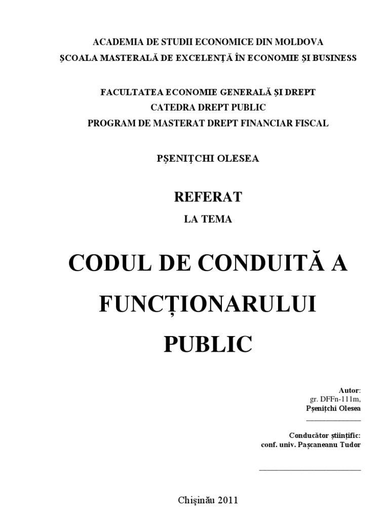 n acest referat voi ncerca s dau difiniie la noiune de funcionar public i voi comenta legea privind codul de conduit a funcionarului public din Republica Moldova. Actualitatea prezentului referat este determinat de faptul c comportamentul real n societate a funcionarilor publici difer mult de normele de conduit a funcionarilor publici i acest referat este prezentat pentru informarea cetenilor cu privire la conduita pe care trebuie s o adopte funcionarul public n vederea oferirii unor servicii publice de calitate, asigurarea unei administrri mai bune ntru realizarea interesului public, contribuirea la prevenirea i eliminarea corupiei din administraia public i crearea unui climat de ncredere ntre ceteni i autoritile publice. n acest referat mi-am propus scopul de a defini noiunea de funcionar public i de a prezenta Legea privind codul de conduit a funcionarului public. Realizarea acestui scop sarcini: Studierea teoretic a noiunii de funcionar public Analizarea principiilor de conduit a funcionarului public Descifrarea normelor de conduit a funcionarului public a naintat studierea i rezolvarea urmtoarelor