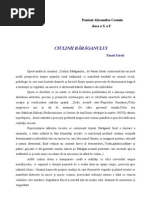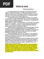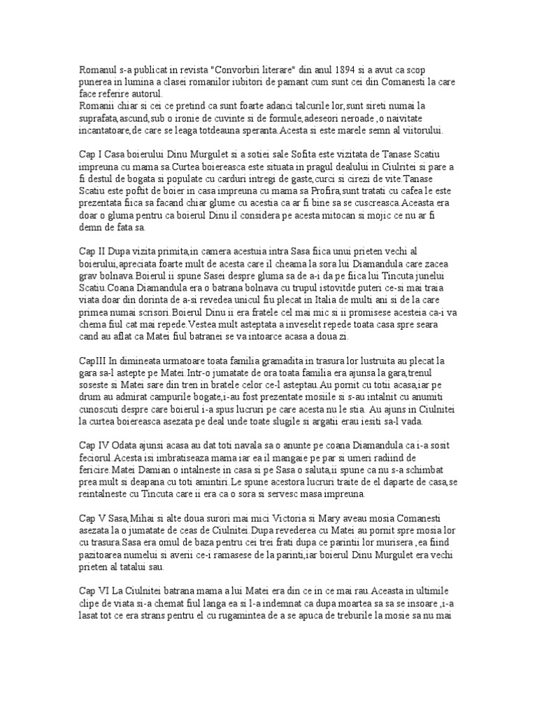 iubitori de pamant cum sunt cei din Comanesti la care face referire autorul. Romanii chiar si cei ce pretind ca sunt foarte adanci talcurile lor,sunt sireti numai la suprafata,ascund,sub o ironie de cuvinte si de formule,adeseori neroade ,o naivitate incantatoare,de care se leaga totdeauna [Link] si este marele semn al viitorului. Cap I Casa boierului Dinu Murgulet si a sotiei sale Sofita este vizitata de Tanase Scatiu impreuna cu mama [Link] boiereasca este situata in pragul dealului in Ciulritei si pare a fi destul de bogata si populate cu carduri intregi de gaste,curci si cirezi de [Link] Scatiu este poftit de boier in casa impreuna cu mama sa Profira,sunt tratati cu cafea le este prezentata fiica sa facand chiar glume cu acestia ca ar fi bine sa se [Link] era doar o gluma pentru ca boierul Dinu il considera pe acesta mitocan si mojic ce nu ar fi demn de fata sa. Cap II Dupa vizita primita,in camera acestuia intra Sasa fiica unui prieten vechi al boierului,apreciata foarte mult de acesta care il cheama la sora lui Diamandula care zacea grav [Link] ii spune Sasei despre gluma sa de a-i da pe fiica lui Tincuta junelui [Link] Diamandula era o batrana bolnava cu trupul istovitde puteri ce-si mai traia viata doar din dorinta de a-si revedea unicul fiu plecat in Italia de multi ani si de la care primea numai [Link] Dinu ii era fratele cel mai mic si ii promisese acesteia ca-i va chema fiul cat mai [Link] mult asteptata a inveselit repede toata casa spre seara cand au aflat ca Matei fiul batranei se va intoarce acasa a doua zi. CapIII In dimineata urmatoare toata familia gramadita in trasura lor lustruita au plecat la gara sa-l astepte pe [Link]-o jumatate de ora toata familia era ajunsa la gara,trenul soseste si Matei sare din tren in bratele celor ce-l [Link] pornit cu totii acasa,iar pe drum au admirat campurile bogate,i-au fost prezentate mosiile si s-au intalnit cu anumiti cunoscuti despre care boierul i-a spus lucruri pe care acesta nu le stia. Au ajuns in Ciulnitei la curtea boiereasca asezata pe deal unde toate slugile si argatii erau iesiti sa-l vada. Cap IV Odata ajunsi acasa au dat toti navala sa o anunte pe coana Diamandula ca i-a sosit [Link] isi imbratiseaza mama iar ea il mangaie pe par si umeri radiind de [Link] Damian o intalneste in casa si pe Sasa o saluta,ii spune ca nu s-a schimbat prea mult si deapana cu toti [Link] spune acestora lucruri traite de el daparte de casa,se reintalneste cu Tincuta care ii era ca o sora si servesc masa impreuna. Cap V Sasa,Mihai si alte doua surori mai mici Victoria si Mary aveau mosia Comanesti asezata la o jumatate de ceas de [Link] revederea cu Matei au pornit spre mosia lor cu [Link] era omul de baza pentru cei trei frati dupa ce parintii lor murisera ,ea fiind pazitoarea numelui si averii ce-i ramasese de la parinti,iar boierul Dinu Murgulet era vechi prieten al tatalui sau. Cap VI La Ciulnitei batrana mama a lui Matei era din ce in ce mai [Link] in ultimile clipe de viata si-a chemat fiul langa ea si l-a indemnat ca dupa moartea sa sa se insoare ,i-a lasat tot ce era strans pentru el cu rugamintea de a se apuca de treburile la mosie sa nu mai