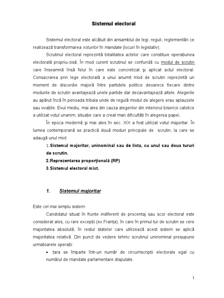 Este cel mai simplu sistem: Candidatul situat n frunte indiferent de procentaj sau scor electoral este considerat ales, cu rare excepii ([Link]), n care n primul tur de scrutin se cere majoritatea absolut; n restul statelor care utilizeaz acest sistem se aplic majoritatea relativ. Din punct de vedere tehnic scrutinul uninominal presupune urmatoarele operaii: