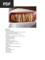 Postat de Sydonia | Etichete: cacao, lapte, margarina, piscoturi, unt Foile: 250 gr fin, 50 gr margarin, o linguri de bicarbonat stins cu 1-2 linguri de lapte, un ou ntreg, 2 linguri de zahr praf, o lingur de cacao. Toate se frmnt, se face o coc care se las s stea jumtate de ora, dup care se coc 2 foi pe dosul tvii, se neap cu furculia pentru a nu face umflaturi. Crema: 600 ml lapte, 4 linguri fin potrivit de pline, 200 gr zahr praf, un zahr vanilat. Se pune la fiert. Cnd este rece se adaug 300 gr unt i se amestec. Sirop: 150 gr de rom, 100 gr zahar, o cana de apa. Cum le aezm: Pe una din foi se pune jumtate din crem, picoturile stropite cu sirop, peste care se pune restul de crem i deasupra a doua foaie. Deasupra se orneaz cu glazur de ciocolat.