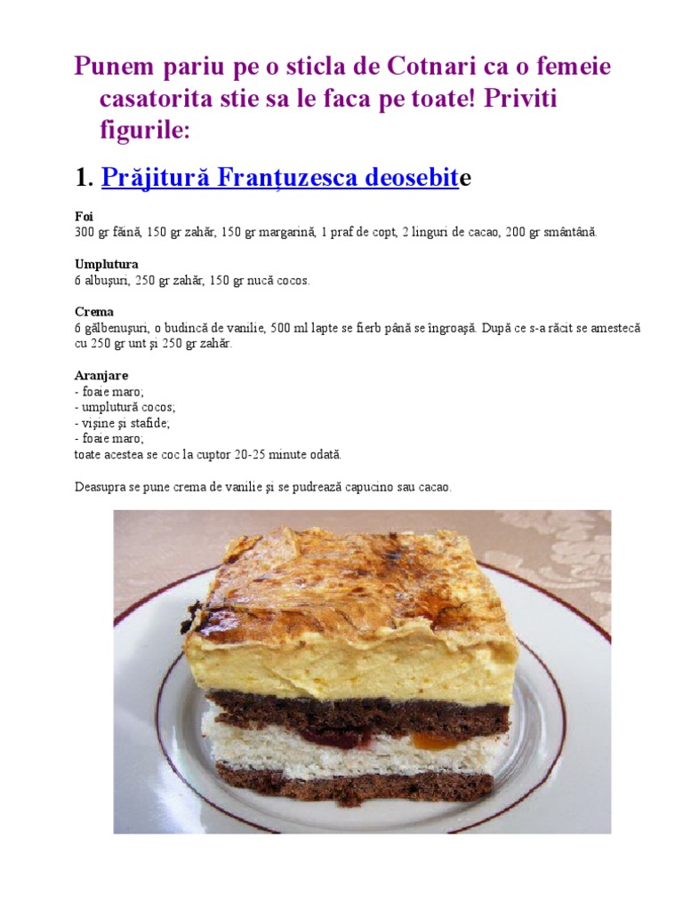 Foi 300 gr fin, 150 gr zahr, 150 gr margarin, 1 praf de copt, 2 linguri de cacao, 200 gr smntn. Umplutura 6 albuuri, 250 gr zahr, 150 gr nuc cocos. Crema 6 glbenuuri, o budinc de vanilie, 500 ml lapte se fierb pn se ngroa. Dup ce s-a rcit se amestec cu 250 gr unt i 250 gr zahr. Aranjare - foaie maro; - umplutur cocos; - viine i stafide; - foaie maro; toate acestea se coc la cuptor 20-25 minute odat. Deasupra se pune crema de vanilie i se pudreaz capucino sau cacao.